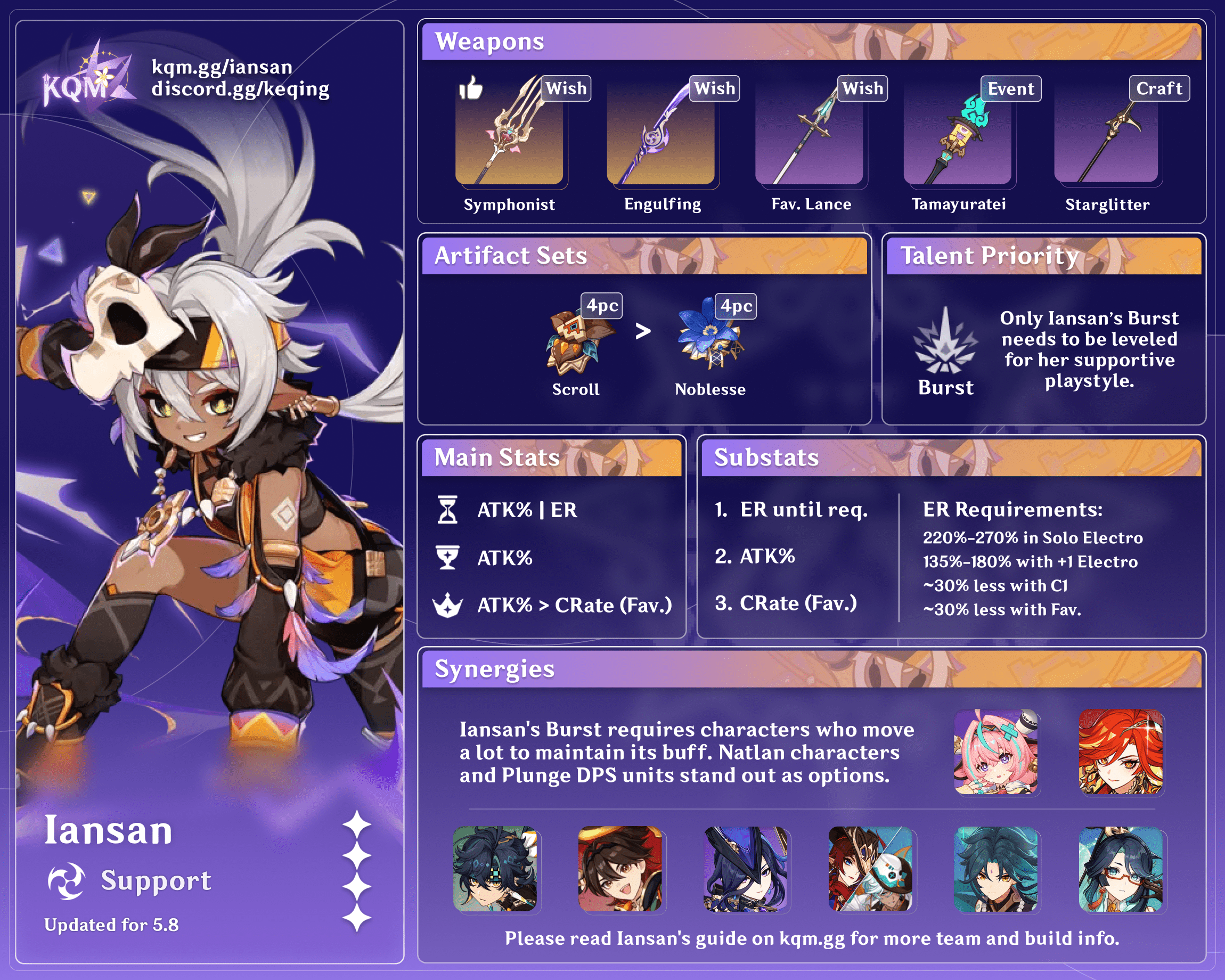 The following table assumes Favonius procs when applicable and that Iansan receives energy from 2pc Scroll. Additional Favonius procs lower ER requirements by ~20-30%.