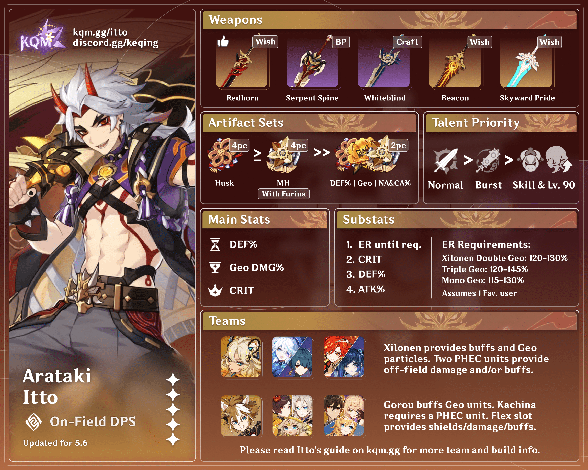 Arataki Itto is a 5★ Geo Claymore character in Genshin Impact who deals sustained on-field Geo damage through his Normal Attacks and special Charged Attacks. Learn about Itto’s best builds, best weapons, best artifacts, and best teams in this quick guide.