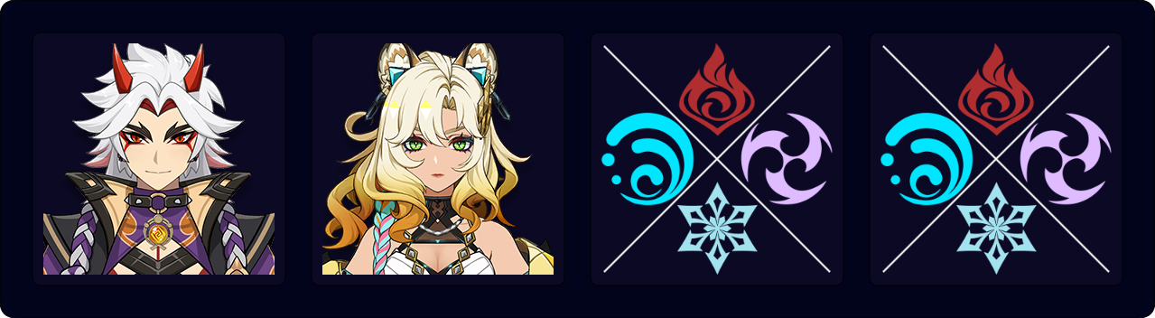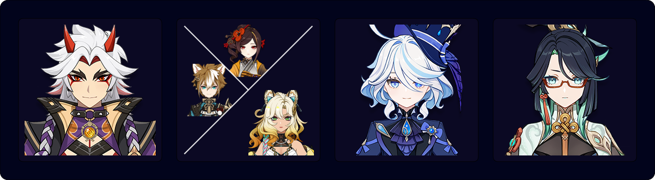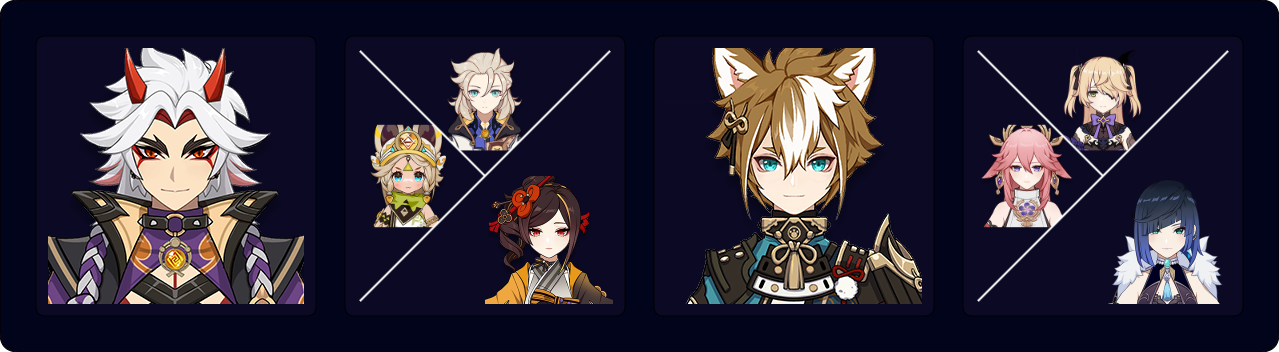 ![]() Yelan | Yelan synergizes particularly well with Furina, forming a strong Double Hydro core, reducing their respective ER requirements. She also provides a ramping DMG% buff for Itto. Itto performs a handful of Normal Attacks in his combos, allowing Yelan to deal damage. If Itto is Constellation 1 or higher (but not C6), it is recommended to perform his Constellation 0 combos to continue benefiting from Yelan’s off-field damage. |