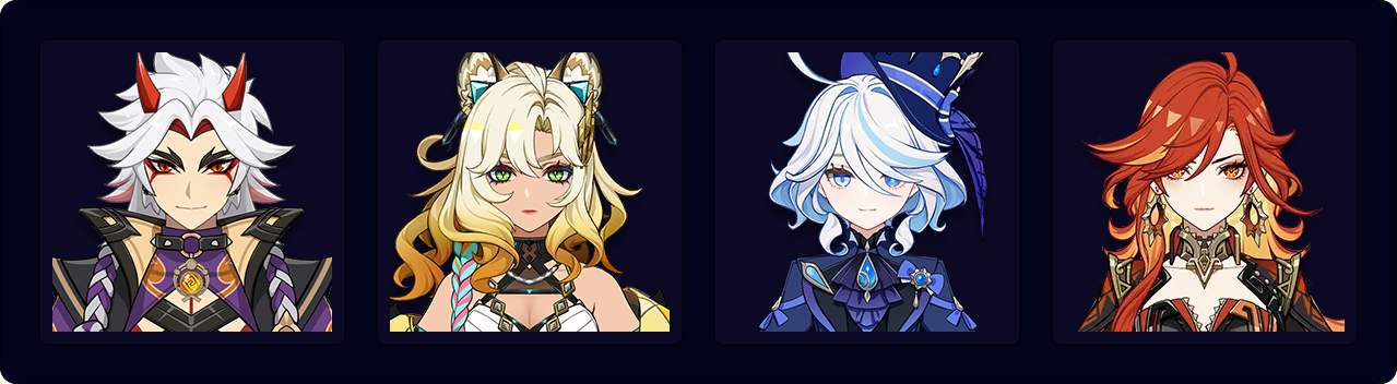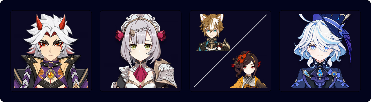 ![]() Furina | Furina provides off-field damage and a strong DMG% buff through her Burst. Furthermore, she opens up a valuable upgrade path to Itto teams through her Constellations. Furina can function without a healer even at C0, though it is not preferred, as her buff and personal damage will decline. Unfortunately, there is only 1 functional healer in Triple Geo compositions: Noelle. In Abyss chambers with long enemy invulnerability windows (e.g., Perpetual Mechanical Array and Maguu Kenki), you can temporarily switch to her healing mode to remedy this. |