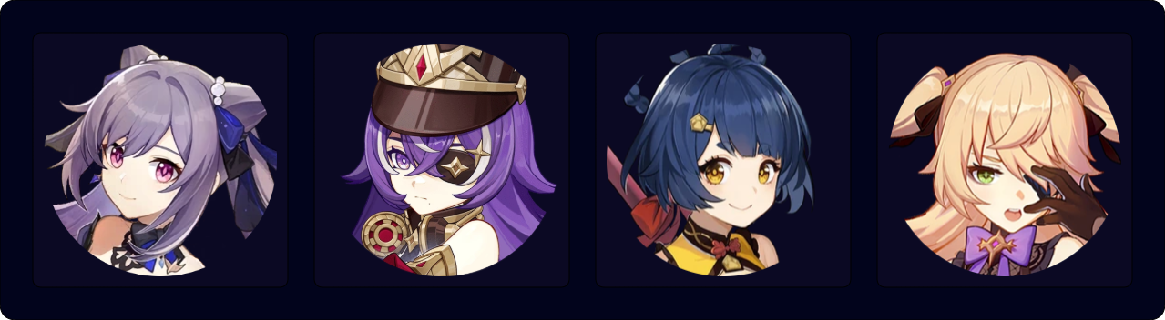 A very strong team that is excellent even without Constellations, but also has incredible potential given vertical investment. Xilonen condenses healing and offensive buffing into one slot, giving Keqing a safe team with a ton of DMG% buffs. Unfortunately, there is one minor point of anti-synergy: the high durability of Lunar-Charged aura and Ineffa’s permanent uptime on her Skill make it largely impossible for Xilonen to Scroll Hydro. (Still, it remains possible in some cases through use of “booking,” i.e. opening the Adventurer Handbook or another pause menu, to dodge global Crystallize ICD.)