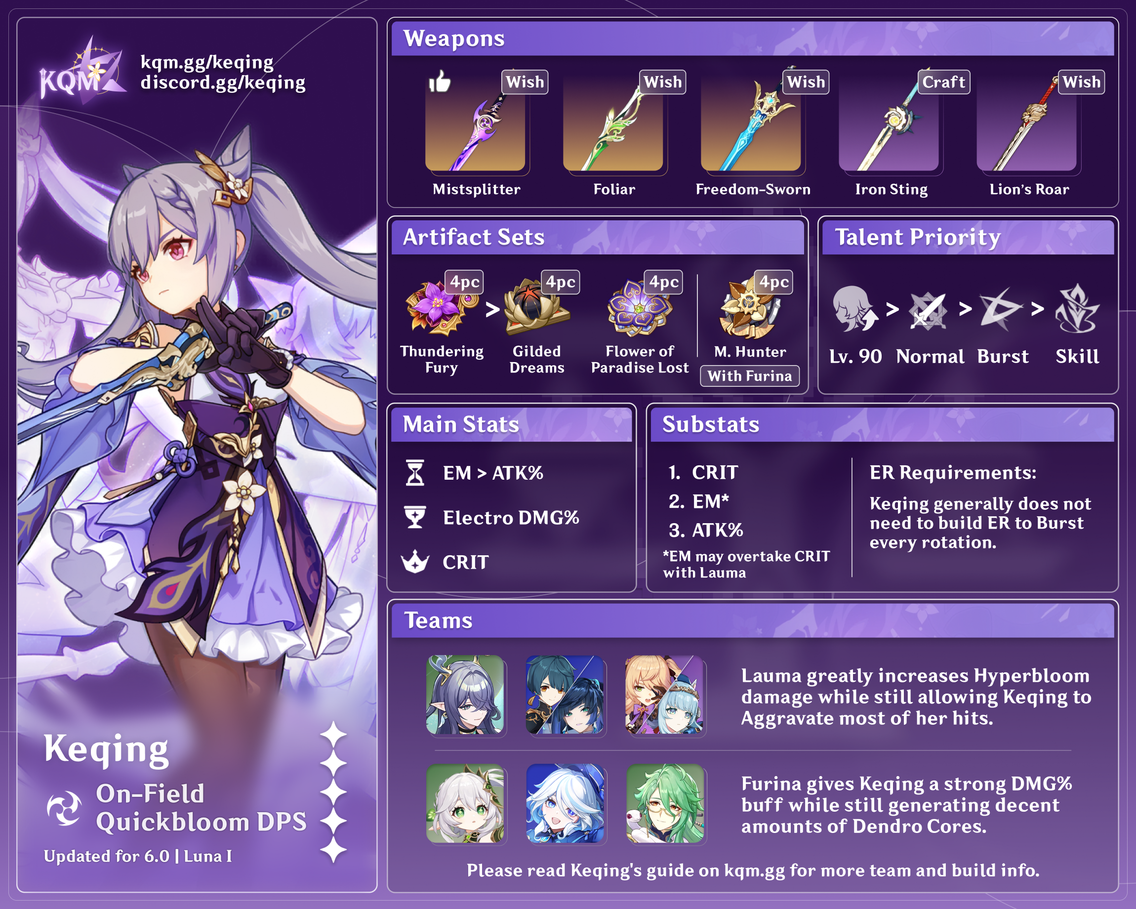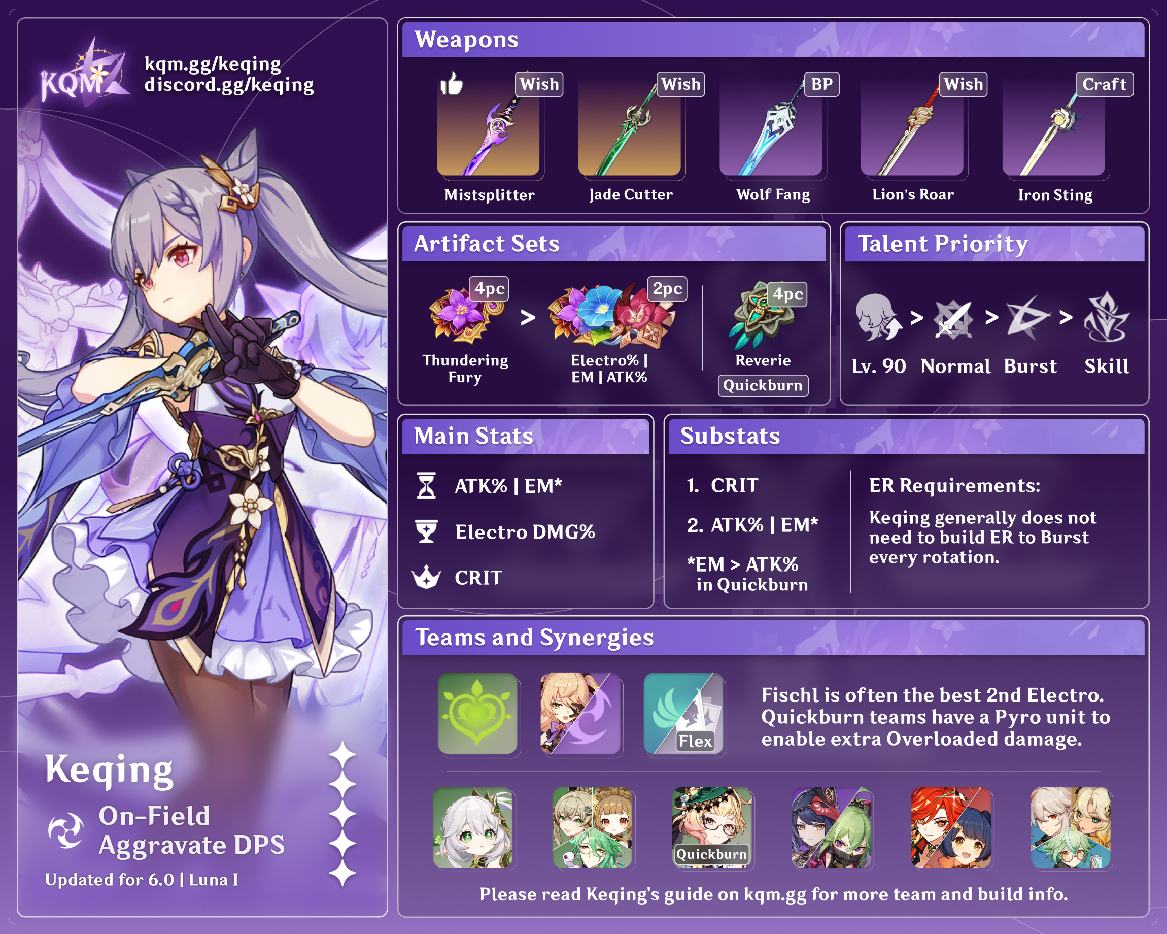 Mavuika | Mavuika has two separate roles depending on the team composition. If she is the only Natlan unit on the team, she runs 4pc Scroll of the Hero of Cinder City and builds full EM, Bursting as available (which tends to be every 2–3 rotations). In this role, she does less personal damage than Xiangling but compensates by buffing Keqing through 4pc Scroll and her occasional DMG% buff from Burst. However, if there is another Natlan support (e.g. Ororon) on the team, Mavuika’s playstyle dramatically shifts. As the other Natlan unit can run 4pc Scroll and charge Mavuika’s Fighting Spirit, Mavuika switches to 4pc Obsidian Codex and builds full DPS, Bursting every rotation. Mavuika can also take some field time so that Keqing does not have to extend her on-field combo to uncomfortably long lengths. |