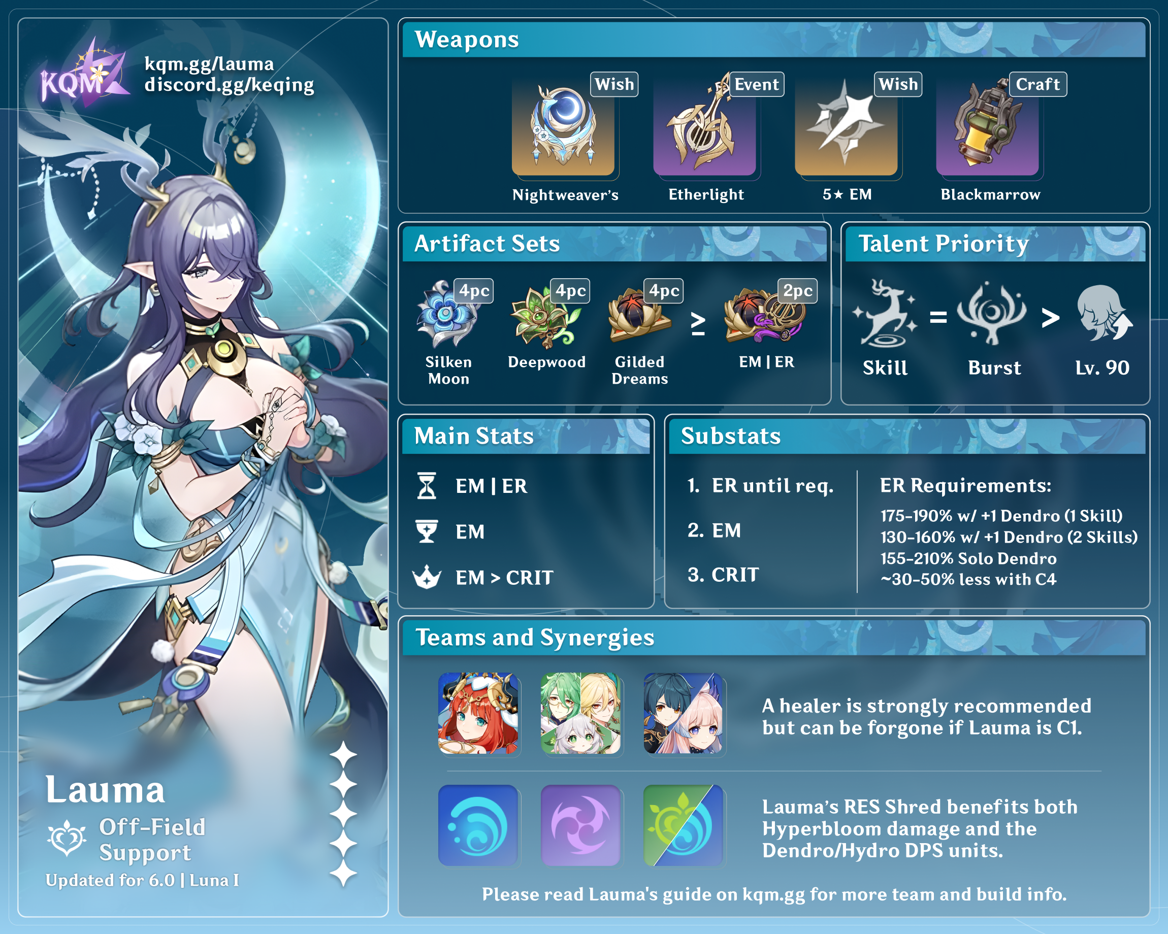 - Since her Lunar-Bloom damage doesn’t scale with ATK or traditional Dendro DMG% buffs, and her Frostgrove Sanctuary represents a smaller part of her total damage, such buffs aren’t important for Lauma.