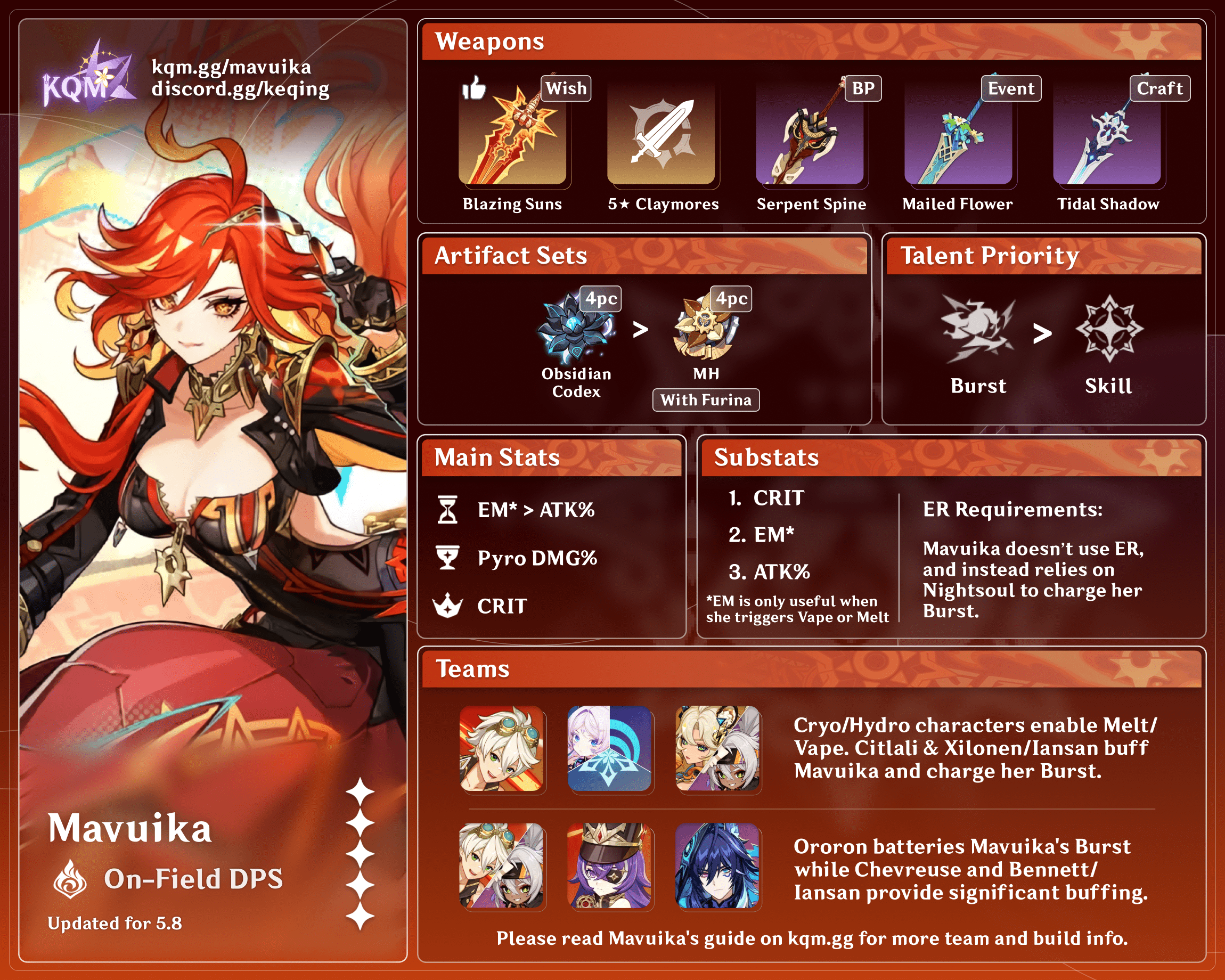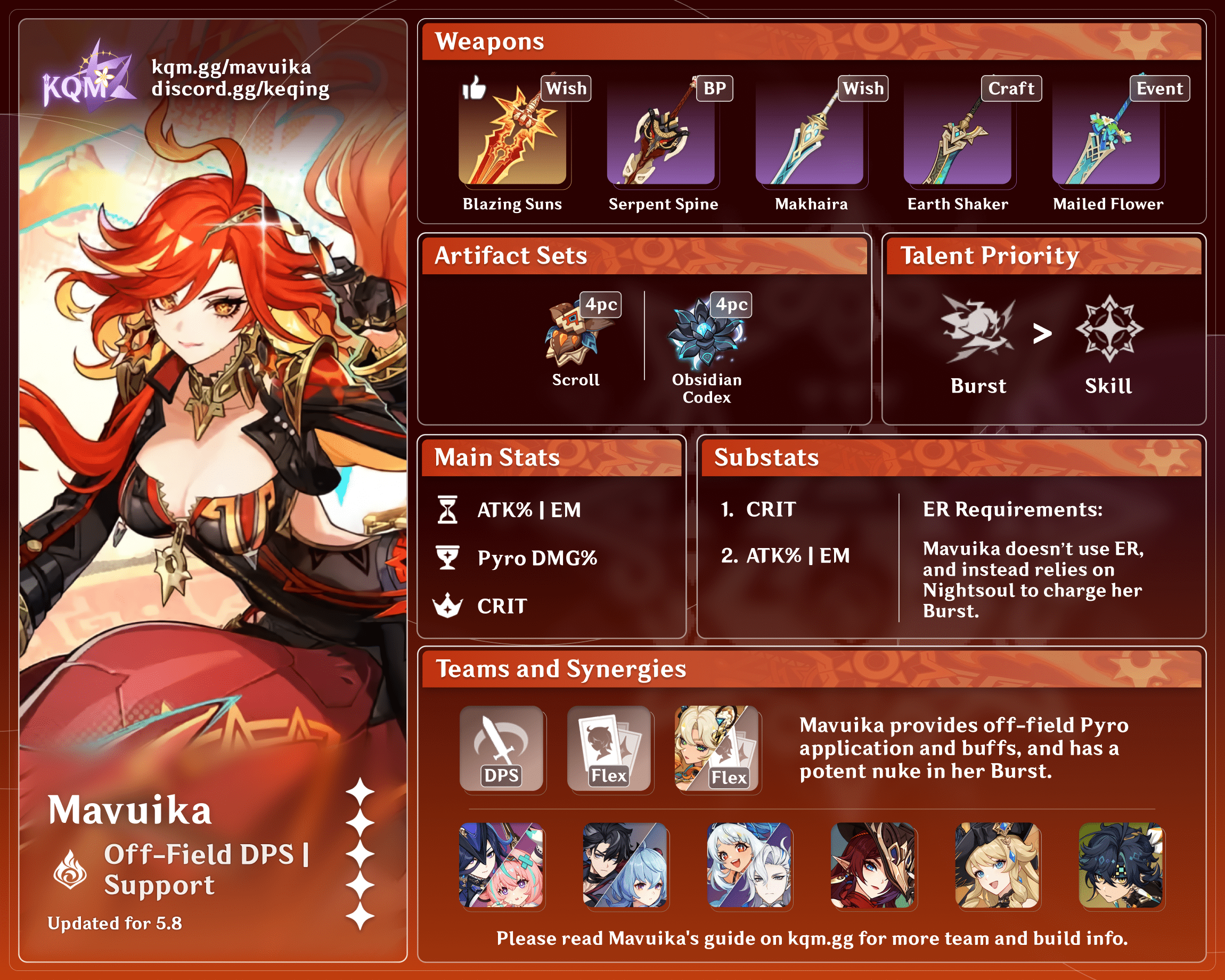 In addition to enabling Melt or Vaporize, Mavuika can also be played with an on-field Electro DPS in Chevreuse teams, or in Burning / Burgeon teams with Kinich. She can also simply play as an off-field damage dealer in Mono Pyro.