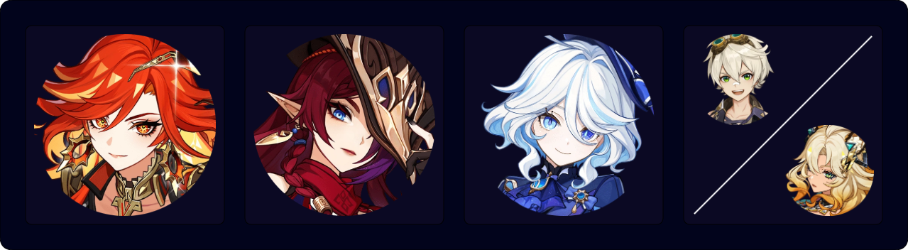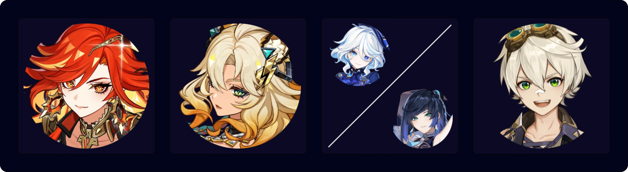 Mavuika can use off-field Hydro appliers to Vaporize her attacks. Furina gives a strong DMG% buff while Yelan has a smaller buff but allows the team to run a faster rotation. Note that Yelan has relatively high ER requirements in this team, so it is a priority to meet her Energy needs by building enough ER% first before investing into their damage.