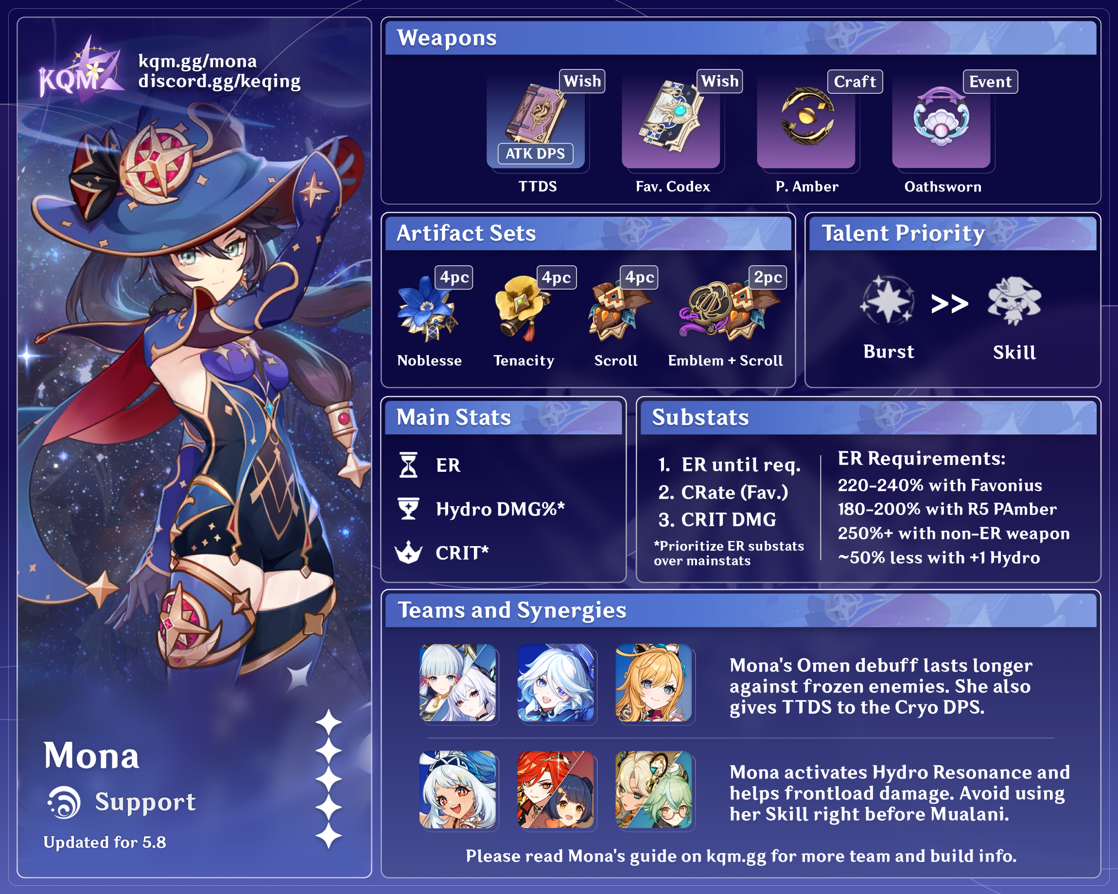 Mona is a 5-star Hydro Catalyst character in Genshin Impact who has a powerful Burst and can be played as either a support unit or an on-field DPS. Learn about Mona’s best builds, Talent priority, best weapons, best artifacts, and best teams in this quick guide.