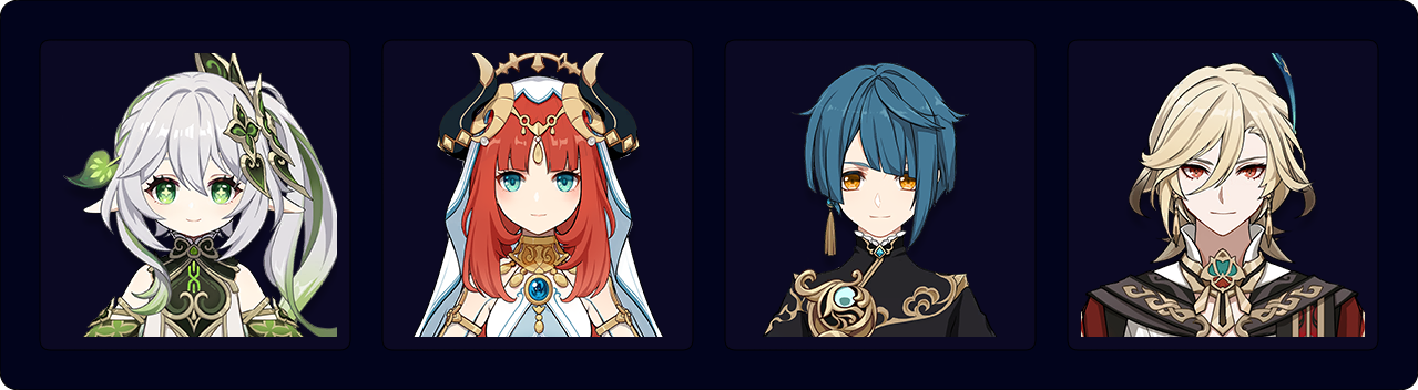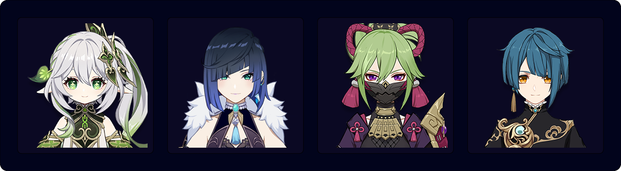Nahida E Q > Xingqiu Q N1 > Kuki E N1> Yelan E N1 Q > Nahida N3 E N3D N3 > Xingqiu N1 E N2 > Nahida N1 E N3D N3 > Yelan E N1 > Kuki Q N1 > Nahida N3D N3