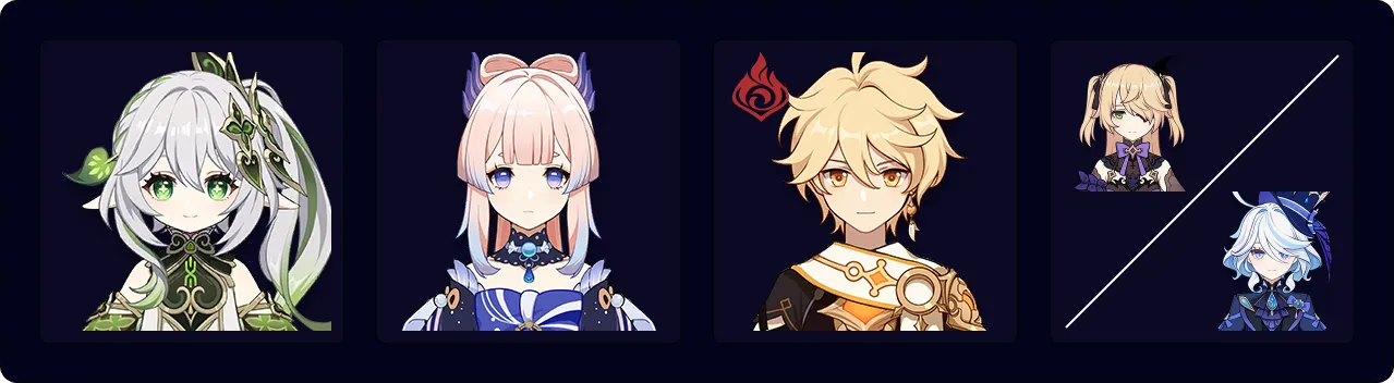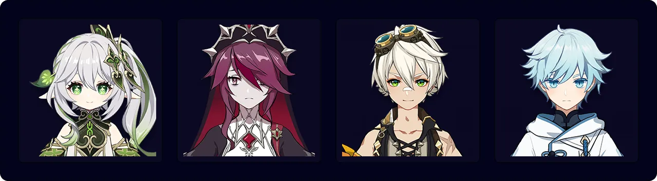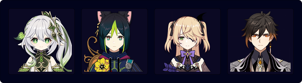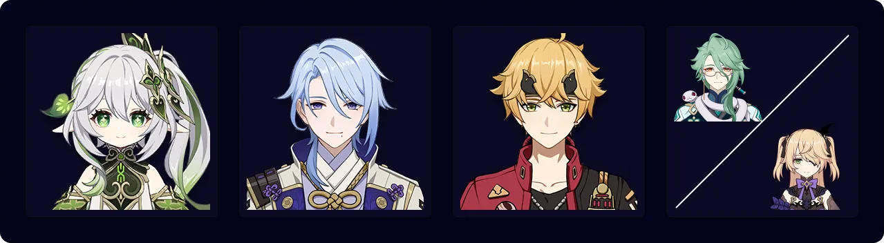 These units apply Hydro on- or off-field to trigger Bloom; they can also consolidate other roles such as healing. For on-field Nahida teams, a second Hydro unit can be used to keep up with Nahida’s Dendro application.