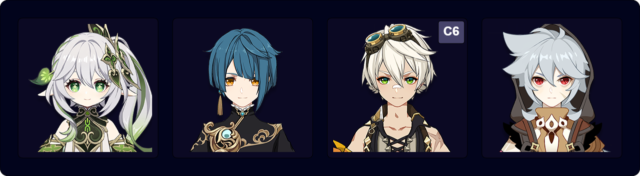 Nahida E Q > Xingqiu EDQ N1 > Kuki E N1 > Alhaitham Q 2[N3D] N2 E 2[N3D] N1C 4[N3D]