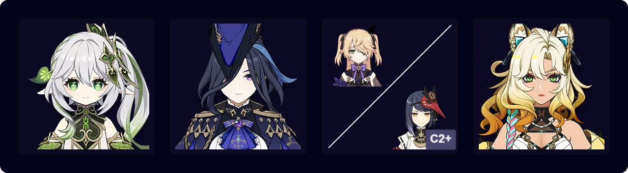 Nilou E N2 E¹ > Nahida N1 E Q > Kirara Q shE²> Neuvillette E C Q C > Kirara shE¹ > Neuvillette C E C > Nahida N1C