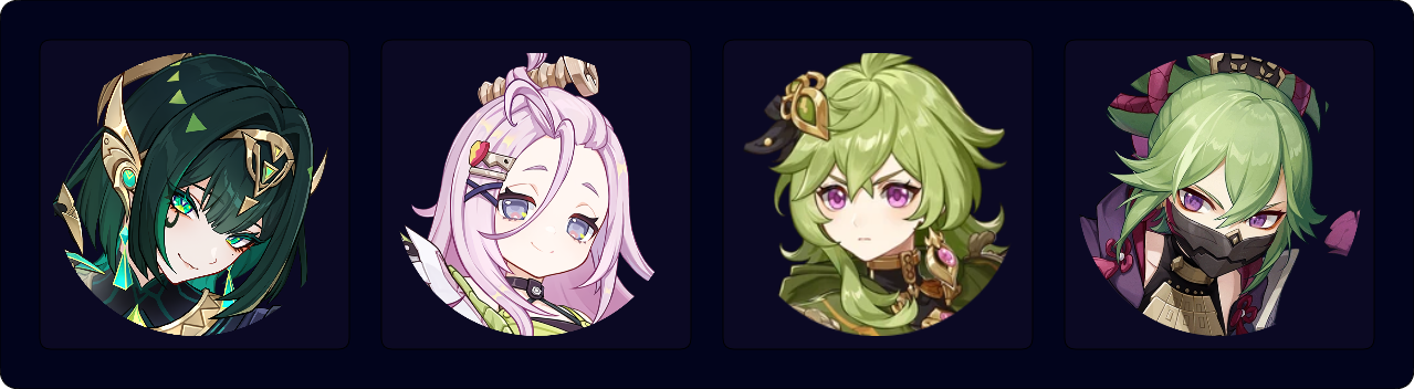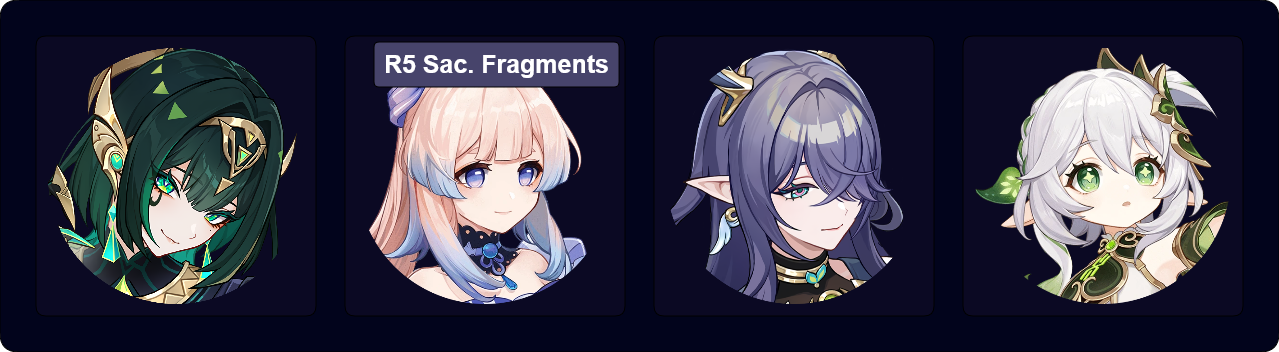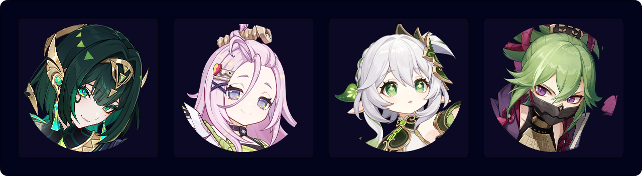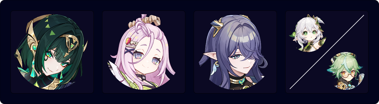 A Hydro unit is mandatory to enable Lunar-Bloom and provide Nefer with Verdant Dews and Veil of Falsehood stacks. A second Dendro is also ideal to start generating Verdant Dews before Nefer’s field time in order to use Nefer’s special Charged Attacks right away. The flex slot is ideally a character who provides relevant buffs and defensive utility if the Hydro and Dendro character do not. One teammate should hold 4pc Deepwood Memories.
