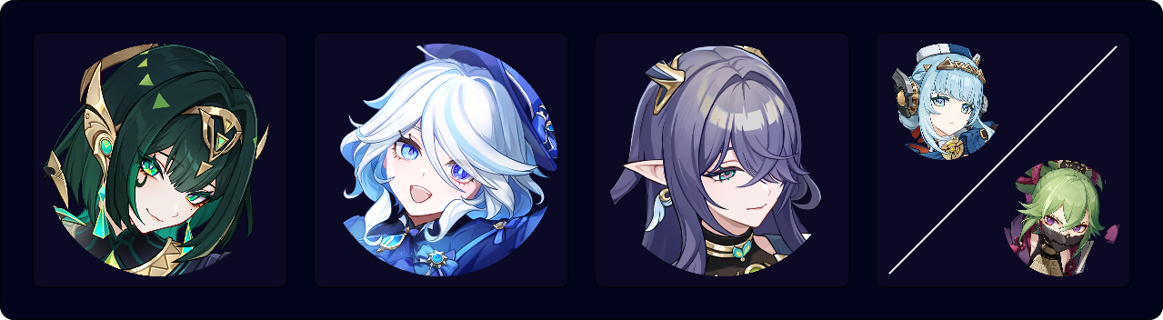 Furina provides consistent off-field Hydro application while Ineffa or Kuki provide sustain. Furina does not use her Burst as her DMG Bonus buff does not benefit Nefer’s Lunar-Bloom damage. Ineffa should Burst every rotation for her A4 Passive’s EM buff.