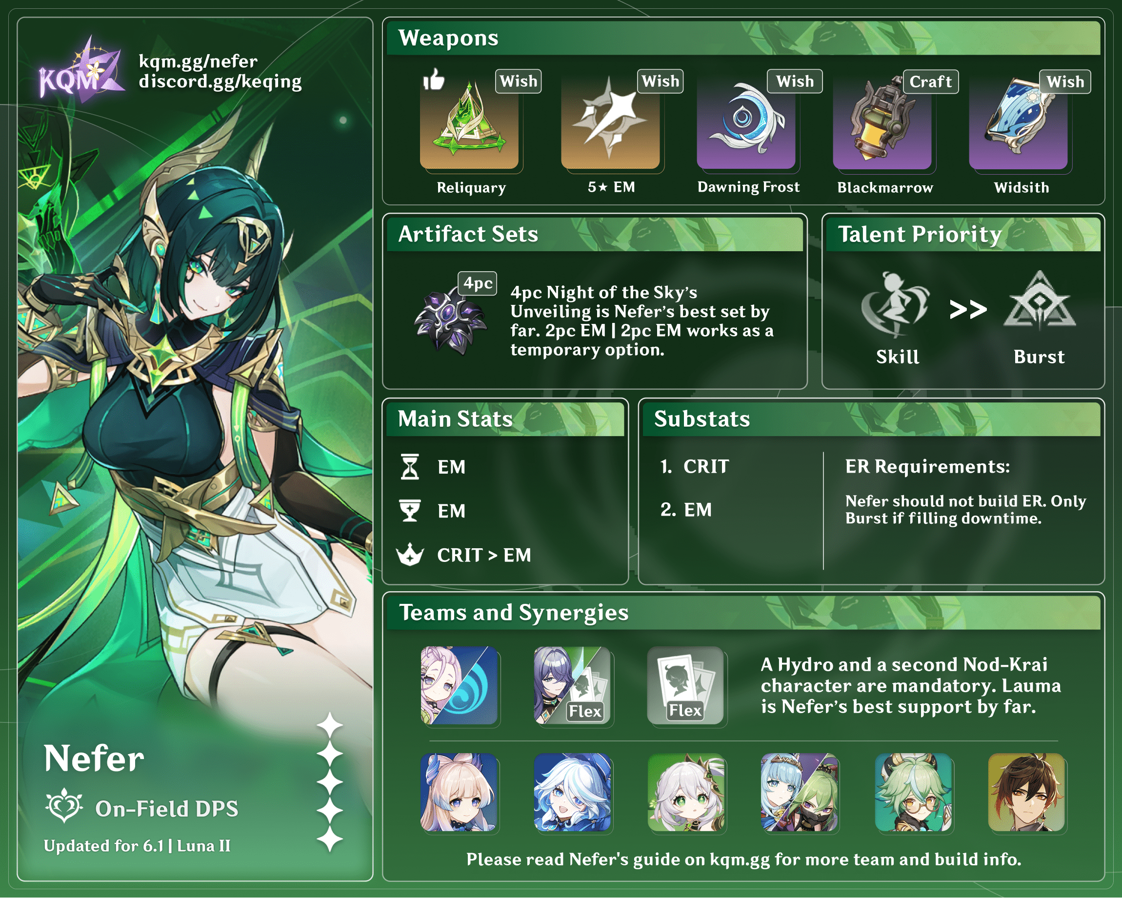 As mentioned in the Combos section, Nefer’s Burst can bide time for Verdant Dew to generate. However, trading CRIT and EM substats for ER ones is not always optimal; consult Genshin Optimizer to compare your actual artifacts.
