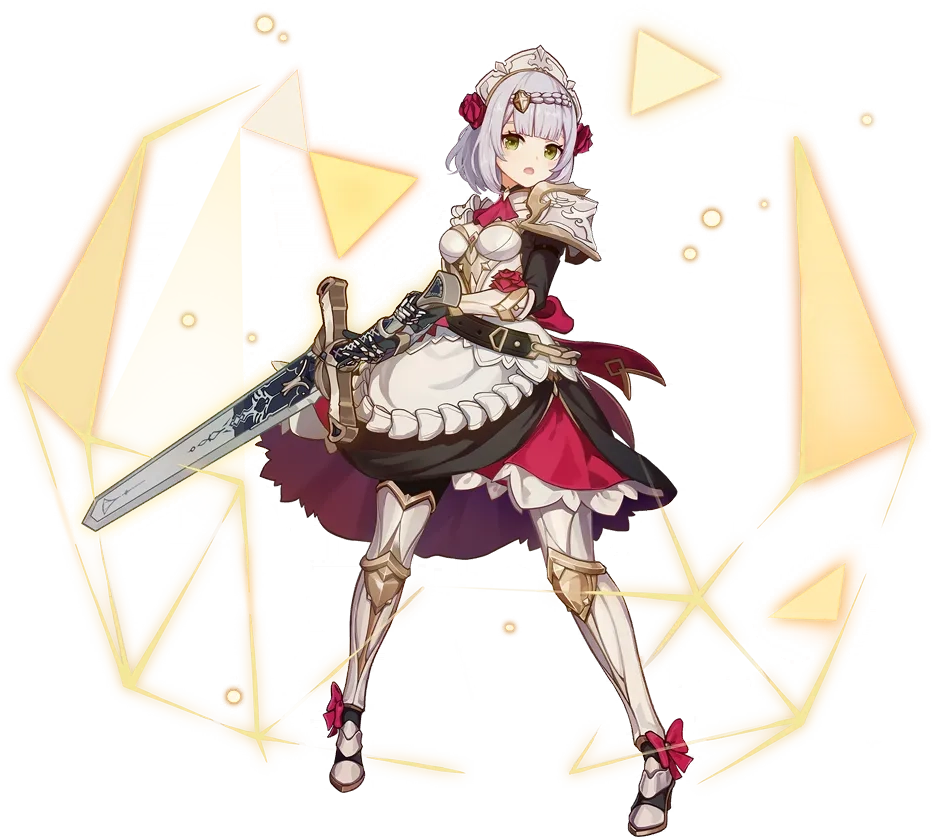Noelle’s Elemental Burst infuses her Normal Attack Talent with Geo and increases her ATK stat based on her DEF stat. Her Geo-infused Normal Attacks have a significantly longer range than her Physical Normal Attacks.