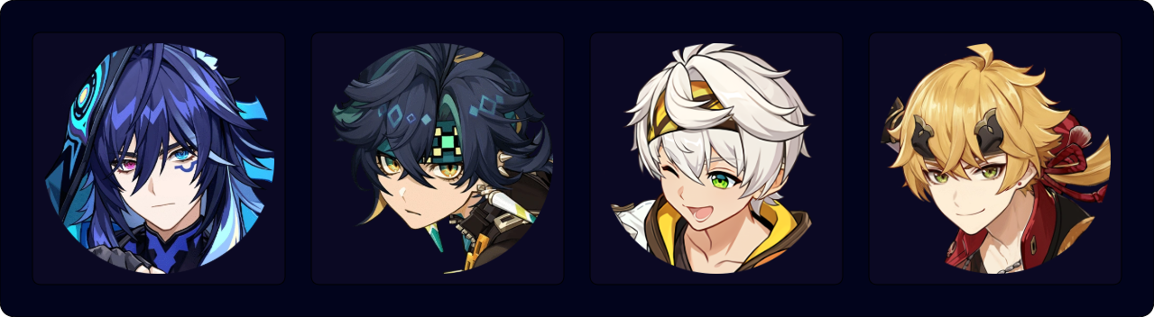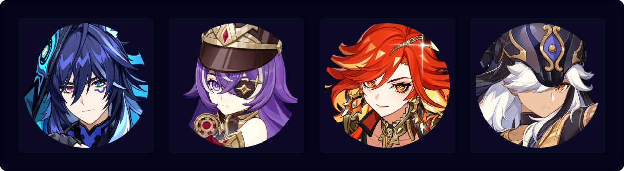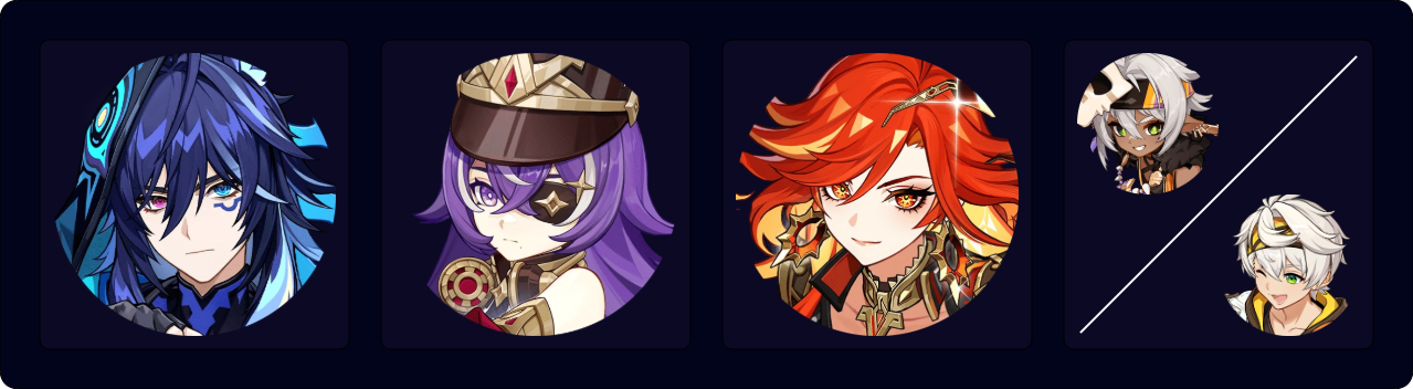A 4-star only team for Mavuika. Mavuika’s performance improves greatly with all her teammates’ C6, but she still outputs impressive damage regardless. A full EM build is optimal for Ororon in this team.