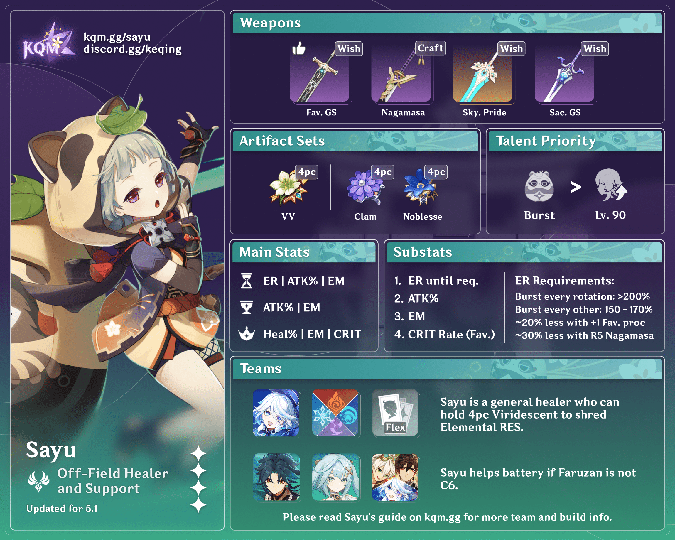 Sayu’s ER requirements can be highly variable depending on her playstyle and team. Use the Energy Recharge Calculator to determine exact requirements for your team and rotation.