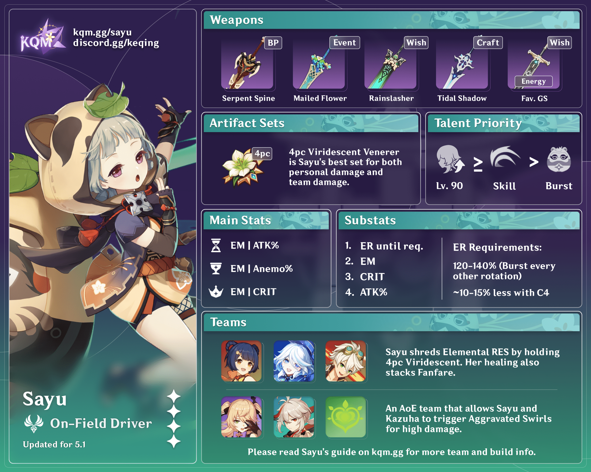 - Sayu as an on-field driver is similarly flexible, although her rolling limits her synergy with characters whose abilities trigger on Normal Attacks (which unfortunately include some of the “best” off-field DPS units such as Xingqiu, Yelan, and Beidou). On-field driver builds will prefer EM if Sayu is triggering Transformative Reactions (Electro-Charged, etc.).