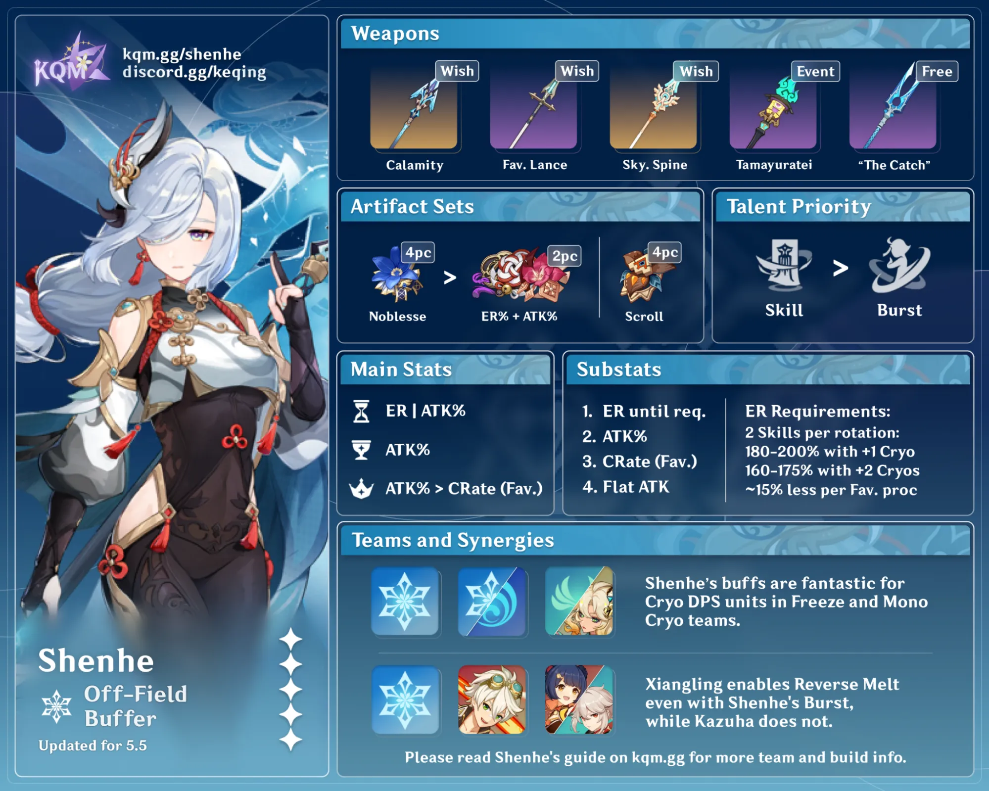 Shenhe is a 5★ Cryo Polearm character in Genshin Impact who provides strong buffs and decent off-field Cryo application. Learn about Shenhe’s best builds, best weapons, best artifacts, and best teams in this quick guide.