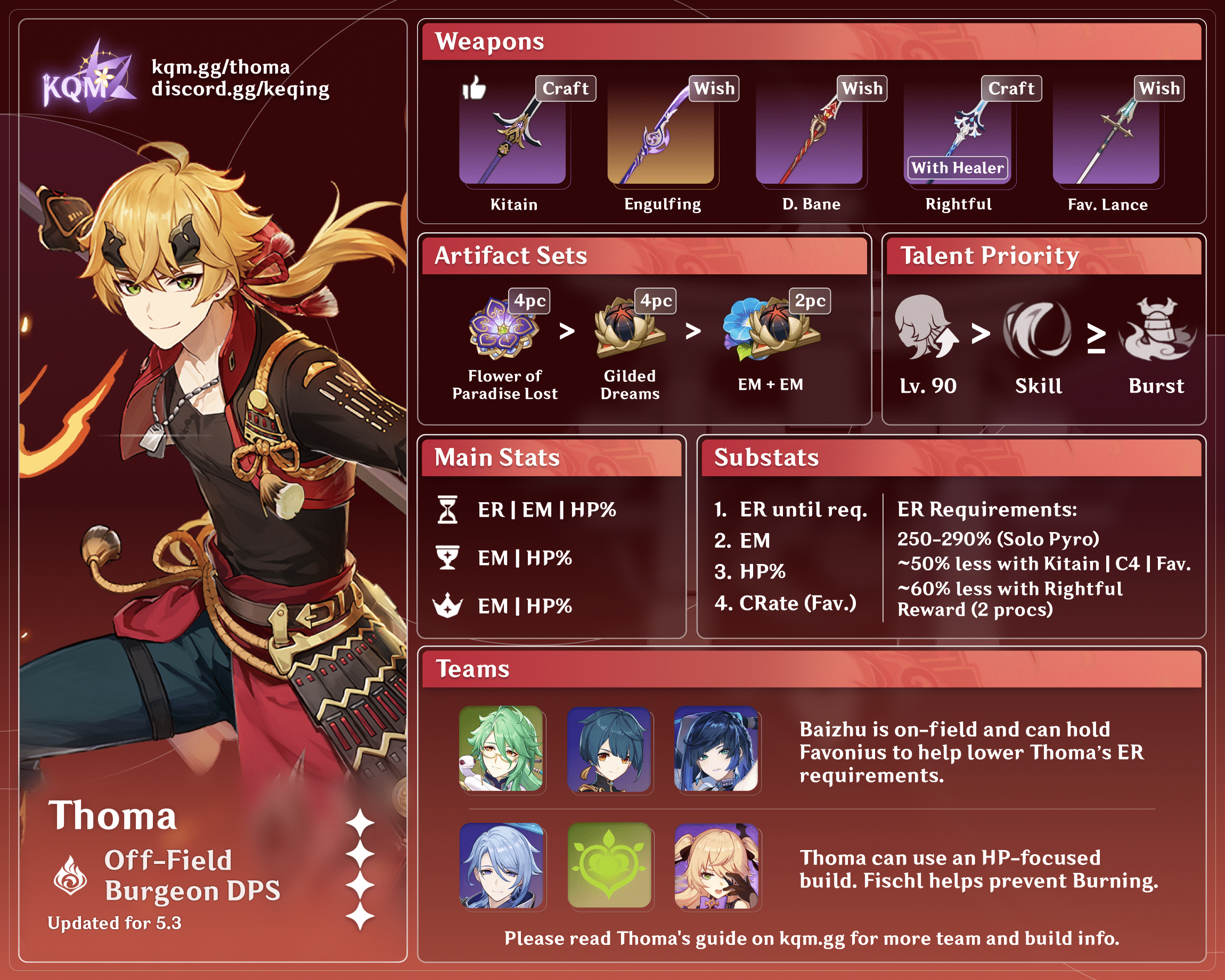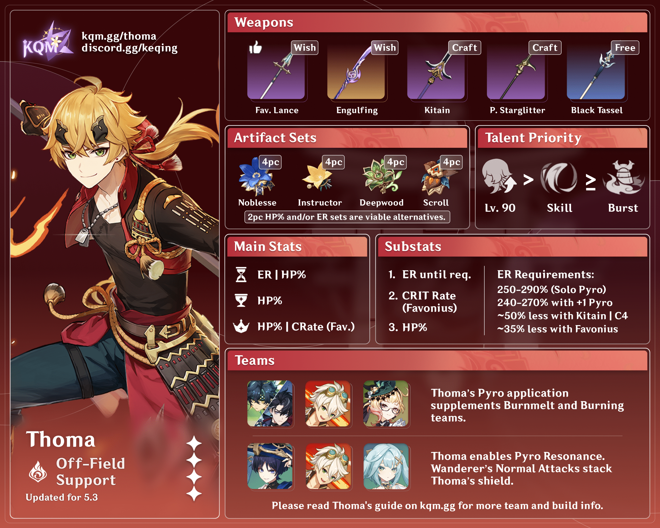 Thoma is a 4-star Pyro Polearm character in Genshin Impact typically used off-field either as a shielder or as a trigger for Burgeon reactions. Learn about Thoma’s best builds, Talent priority, best weapons, best artifacts, and best teams in this quick guide.