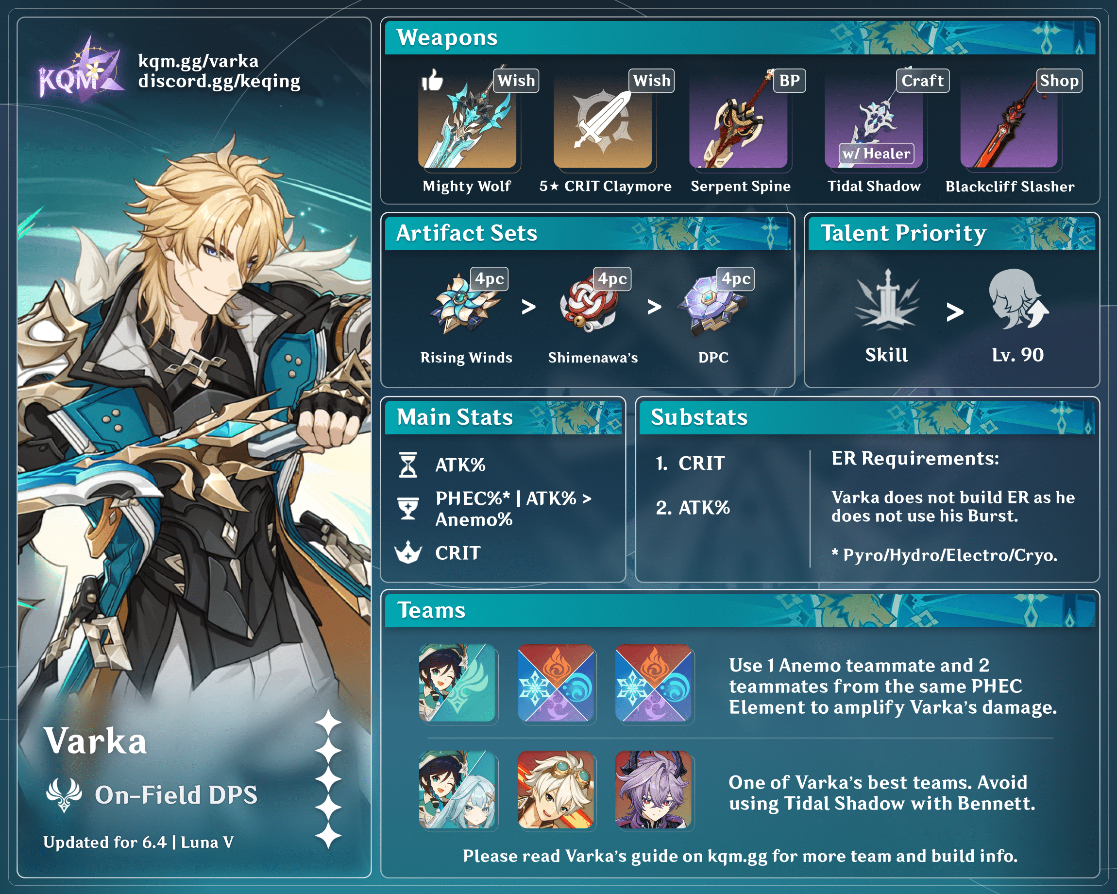 Mona | Mona is a good buffer for Varka in Double Hydro teams, especially at C4, when she provides 15% CRIT Rate and CRIT DMG from her Burst in addition to the 60% DMG Bonus. While Mona can hold TTDS, she often switches to the other Anemo teammate to maintain 4pc VV RES Shred uptime; this makes other weapons such as Favonius Codex or Prototype Amber more recommended. She is best used in a team with Furina and Jean (preferably with Jean’s C4 too). |