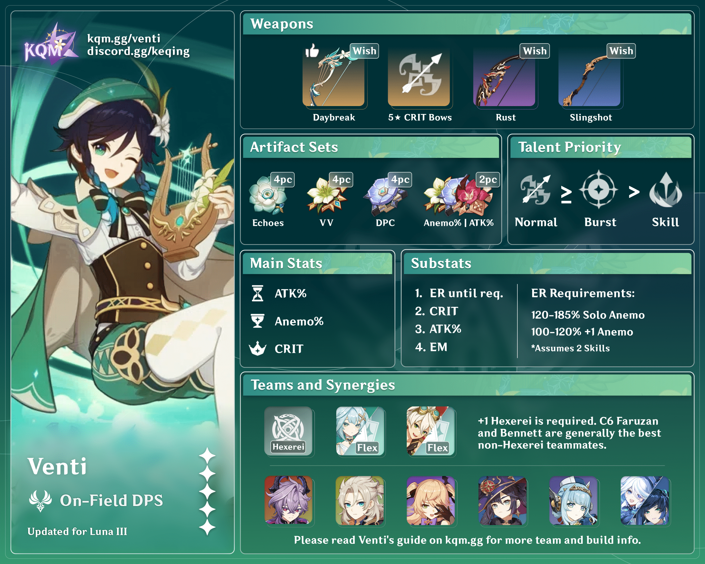 Venti has 132% base ER when fully ascended thanks to his Ascension stat, making these numbers generally easy to reach. If using Favonius Warbow, his ER requirements will be met with the weapon’s secondary stat and passive alone.