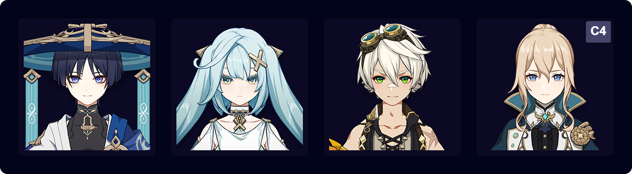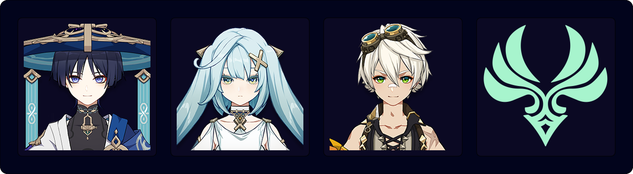 Unlike in other driver teams, Wanderer prefers his conventional hypercarry build in this team because Thoma is the primary Burgeon trigger. Thoma offers a shield to protect Wanderer from interruption and provides Pyro to trigger Wanderer’s A1 Pyro buff. Xingqiu provides high off-field Hydro application and extra utility. Yelan can also be used for her ramping DMG% buff, but she has lower Hydro application than C6 Xingqiu.