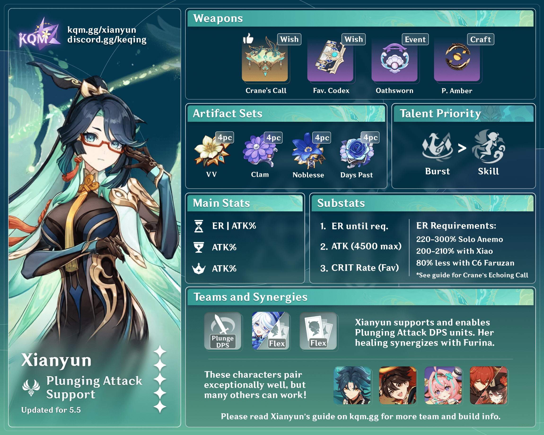 ![]() Additional Supports | While Xianyun provides healing, a Plunging Attack buff, and other buffs via passives, other supports can also be valuable members of the team. Shielders like Zhongli and Layla can prevent the on-field Plunging Attack DPS unit from being interrupted. ATK buffs from Bennett, a 4pc Noblesse Oblige user, or a 4pc Tenacity of the Millelith user are good since all Plunging Attack damage scales with ATK. Other kinds of buffs from Furina, Yelan, Faruzan, C6 Sara, and Shenhe are also appreciated. |