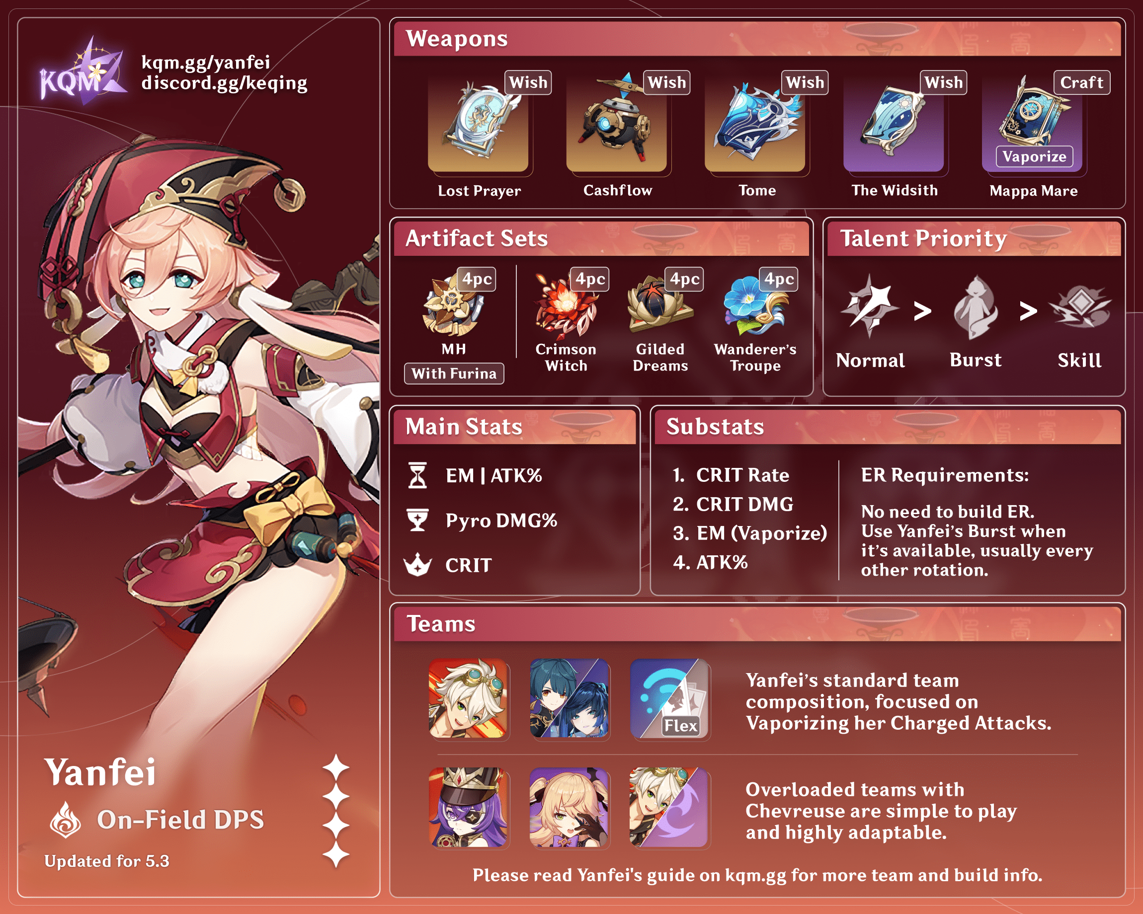 The full-length guide is available here. It is heavily outdated and currently being updated, please visit our Discord to learn more about Yanfei.