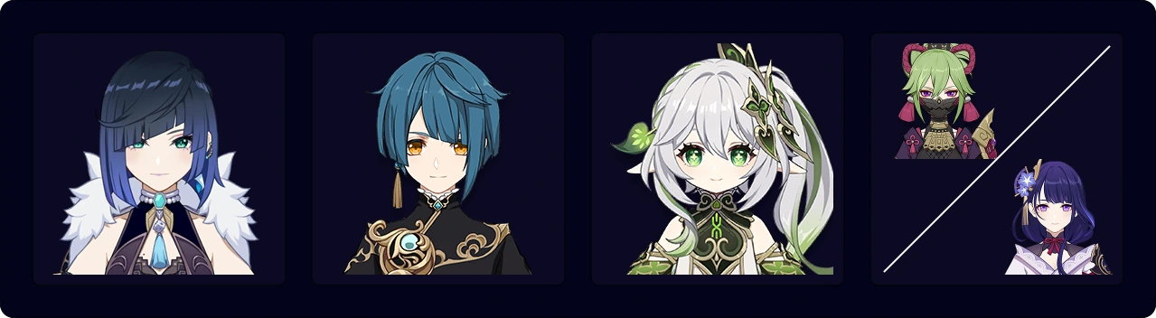 Nahida E Q > Xingqiu Q N1 > Shinobu E N1> Yelan E Q > Nahida N3 E N3D N3 > Xingqiu N1 ED N2 > Nahida E N3D N3 > Yelan E N2 > (Shinobu Q N1)1 > Nahida N3D N3