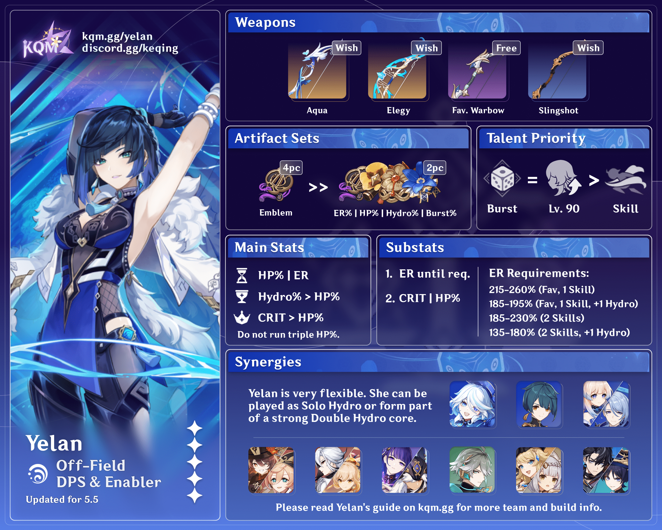 Yelan is a 5★ Hydro Bow character in Genshin Impact who specializes in off-field single-target damage and Elemental application. Learn about Yelan’s best builds, best weapons, best artifacts, and best teams in this quick guide.