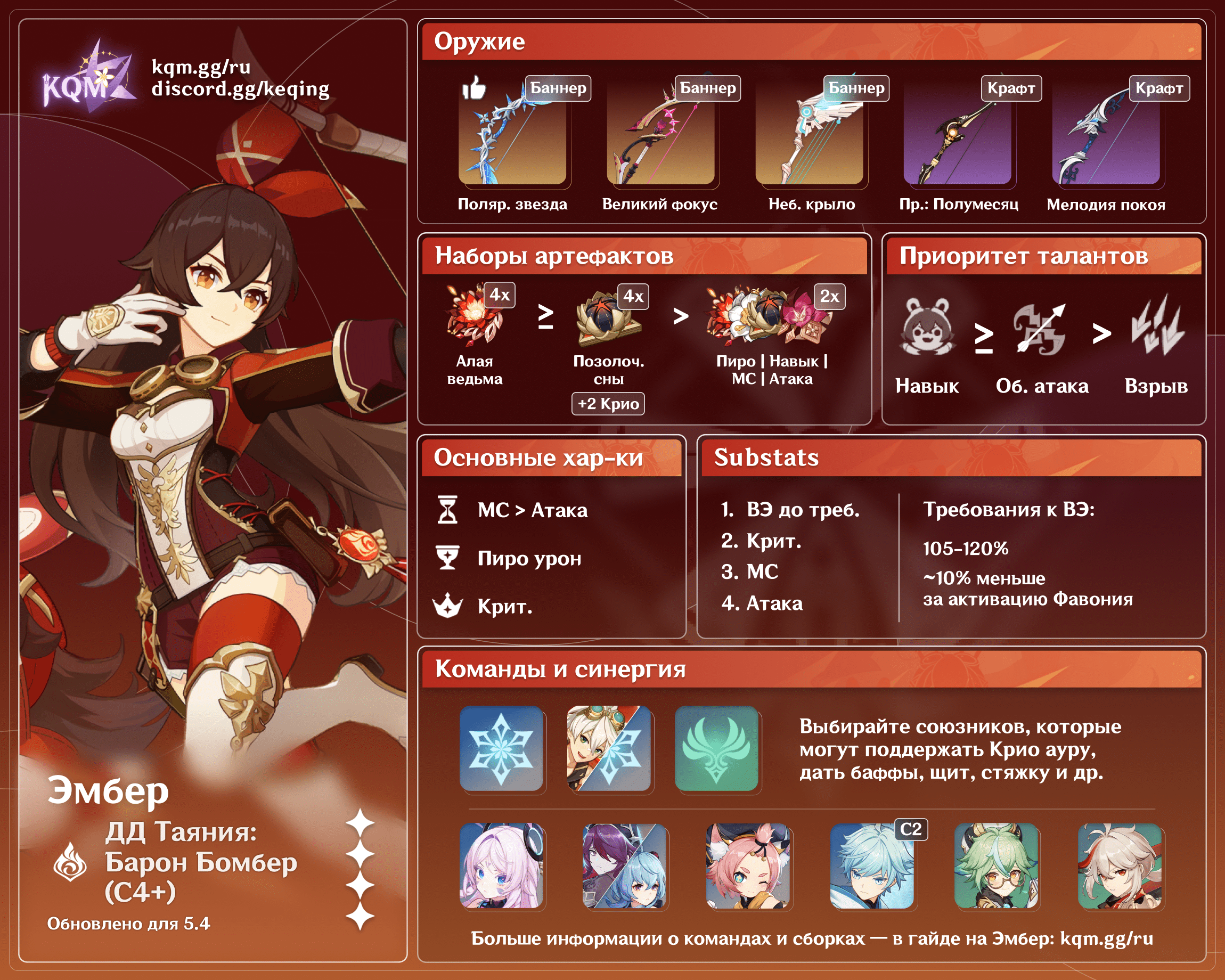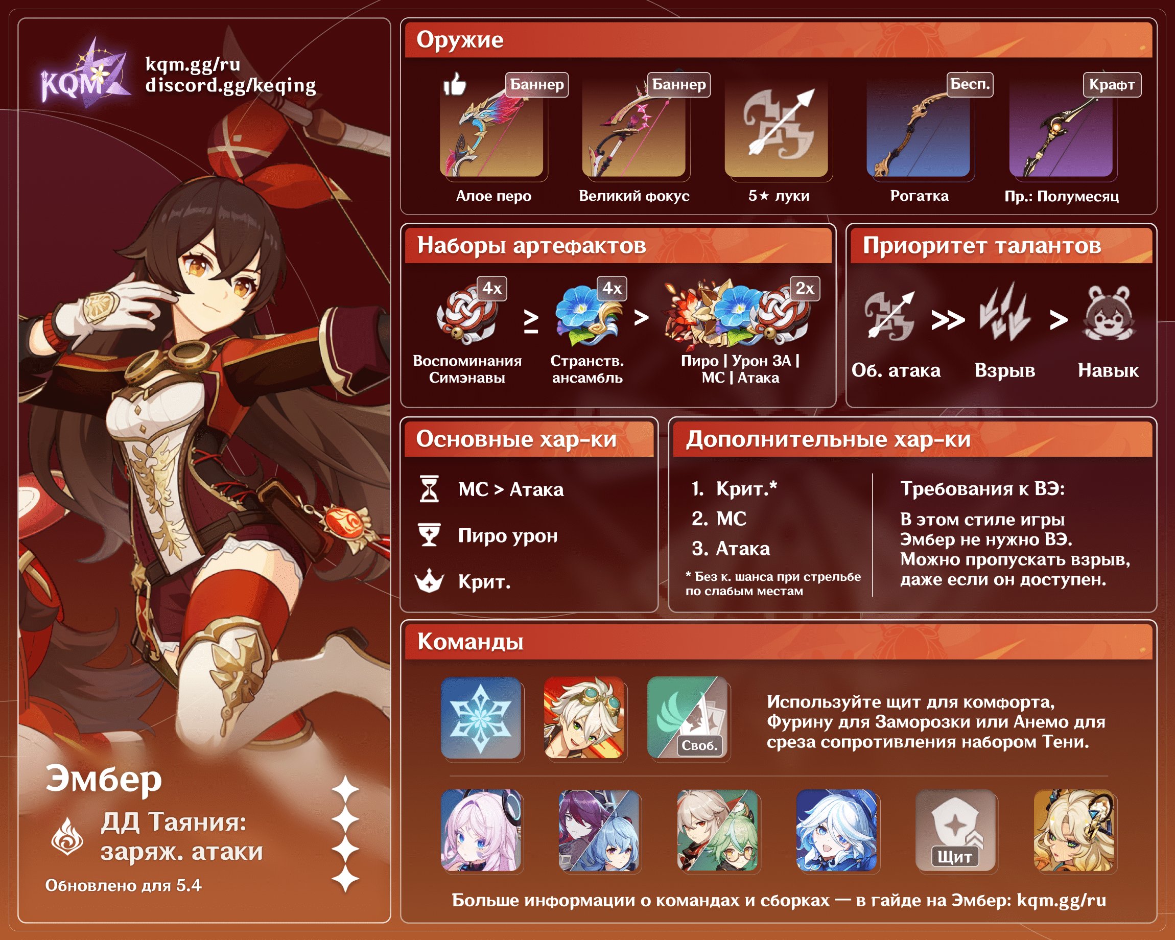 | Другие луки на ВЭ | Способность Эмбер вызывать взрыв по готовности в данном архетипе важнее, чем ее урон. Это делает луки, удовлетворяющие ее потребности в ВЭ, весьма полезными. |
