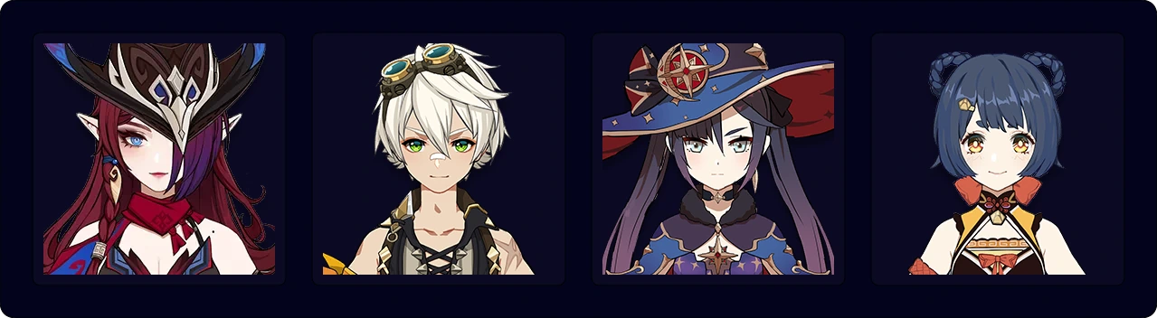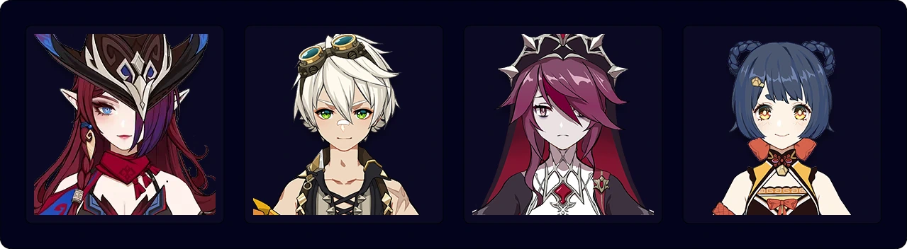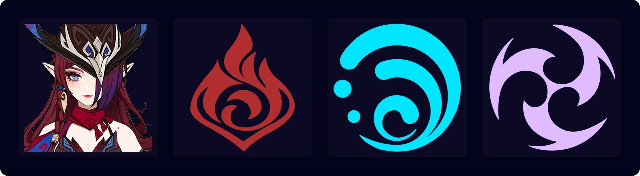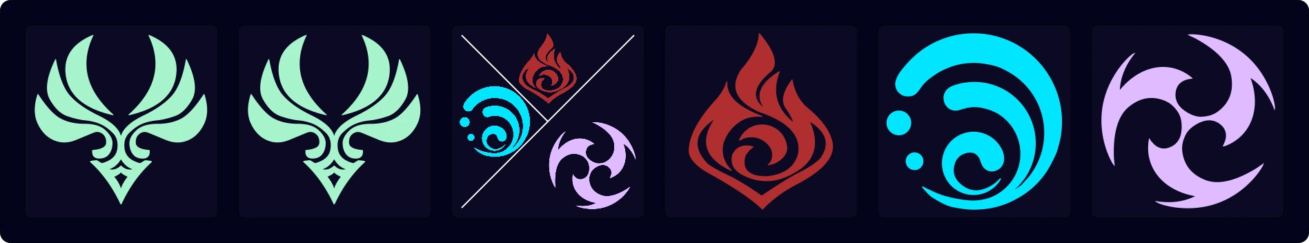 - Не имеет синергии с большинством бафферов из-за того, что ее урон разделен на разные элементы, а также из-за того, что ее нежелательно использовать с персонажами, которые являются не Пиро / Гидро / Электро / Крио