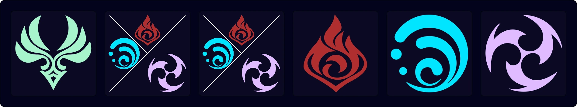 - Пули 4 / 5 / 6 конвертируются случайно, в зависимости от элементов ее союзников, а каждый элемент союзников будет представлен пулей. Например, если команда будет Пиро / Пиро / Гидро, пули будут Пиро / Пиро / Гидро, а их порядок будет случайным. Например, их порядок может быть Гидро / Пиро / Пиро.