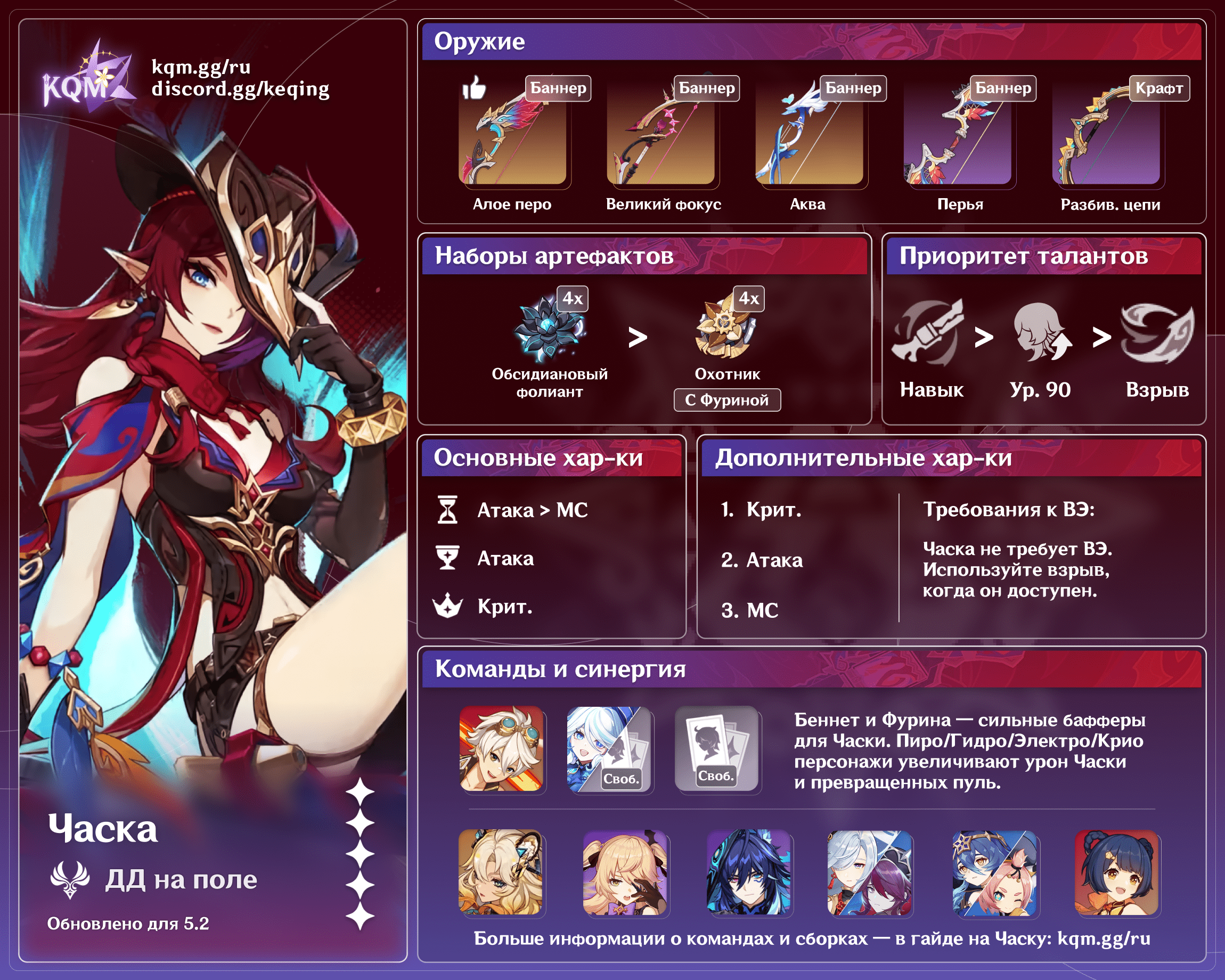 Часка — 5-звездочная Анемо лучница в Genshin Impact, которая преобразует свои заряженные атаки в элементы ее союзников перед выстрелом во врагов. Из этого краткого гайда вы узнаете о лучших билдах, оружии, артефактах и отрядах для Часки.