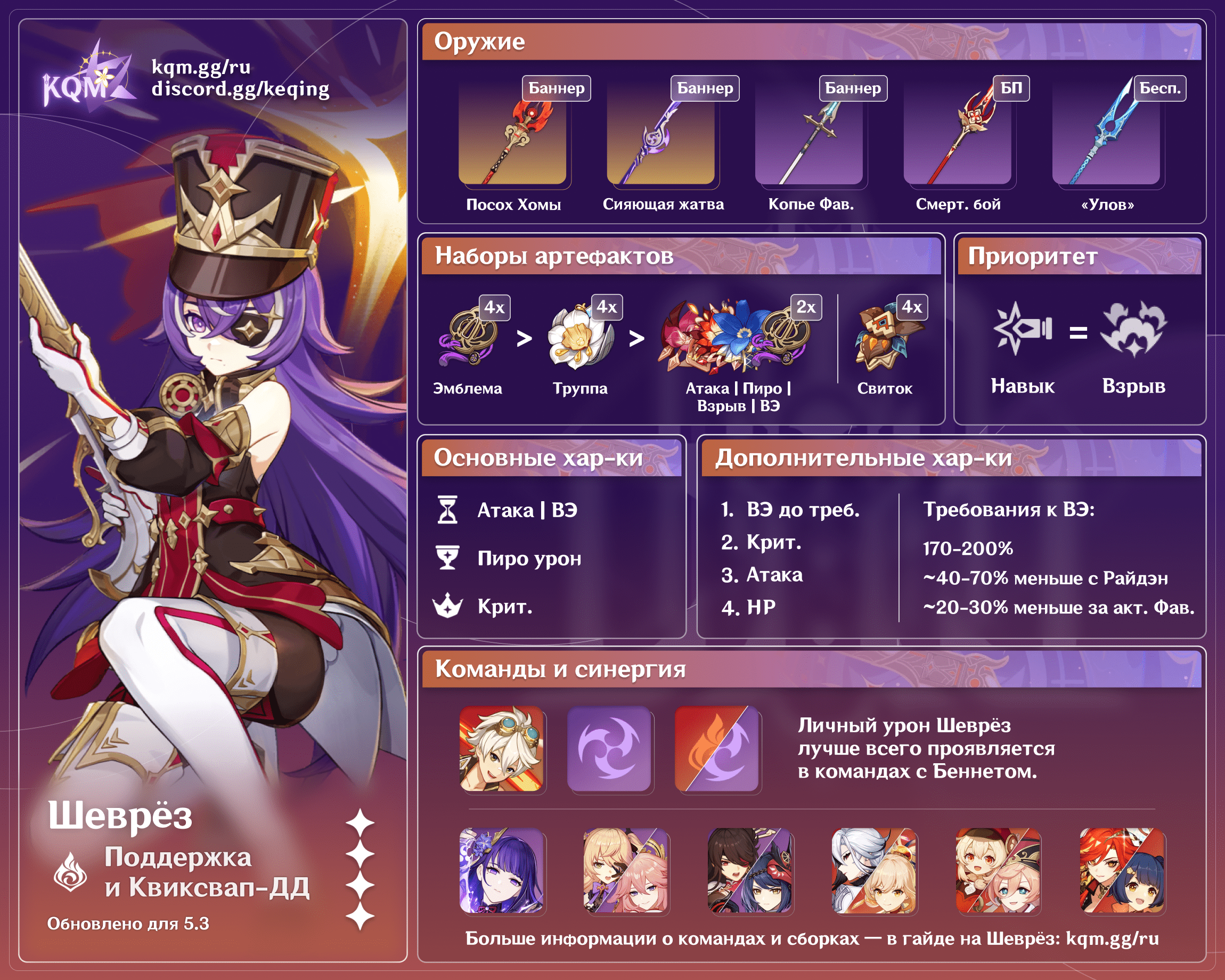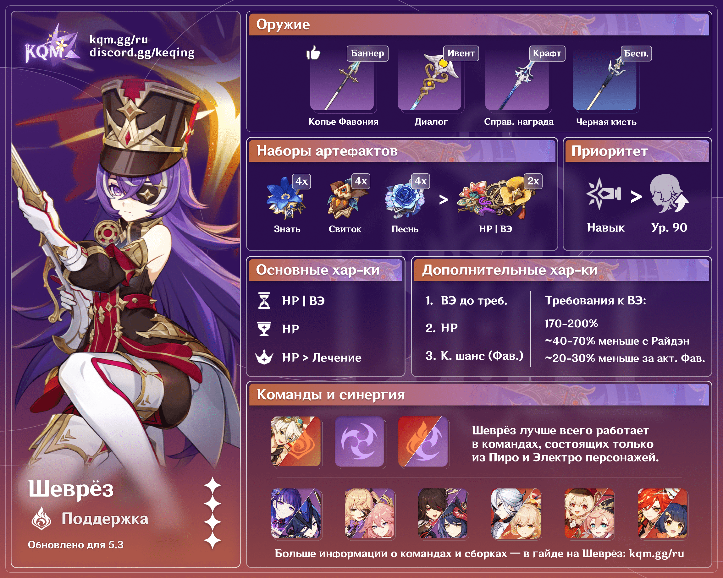 Шеврёз — 4-звездочная Пиро копейщица в Genshin Impact. Ее лучшая роль — персонаж поддержки в отрядах от Перегрузки, дающий союзникам баффы на силу атаки и снижающий сопротивление врагов к Пиро и Электро. В этом кратком гайде вы узнаете о лучших сборках, оружии, артефактах и отрядах для Шеврёз.