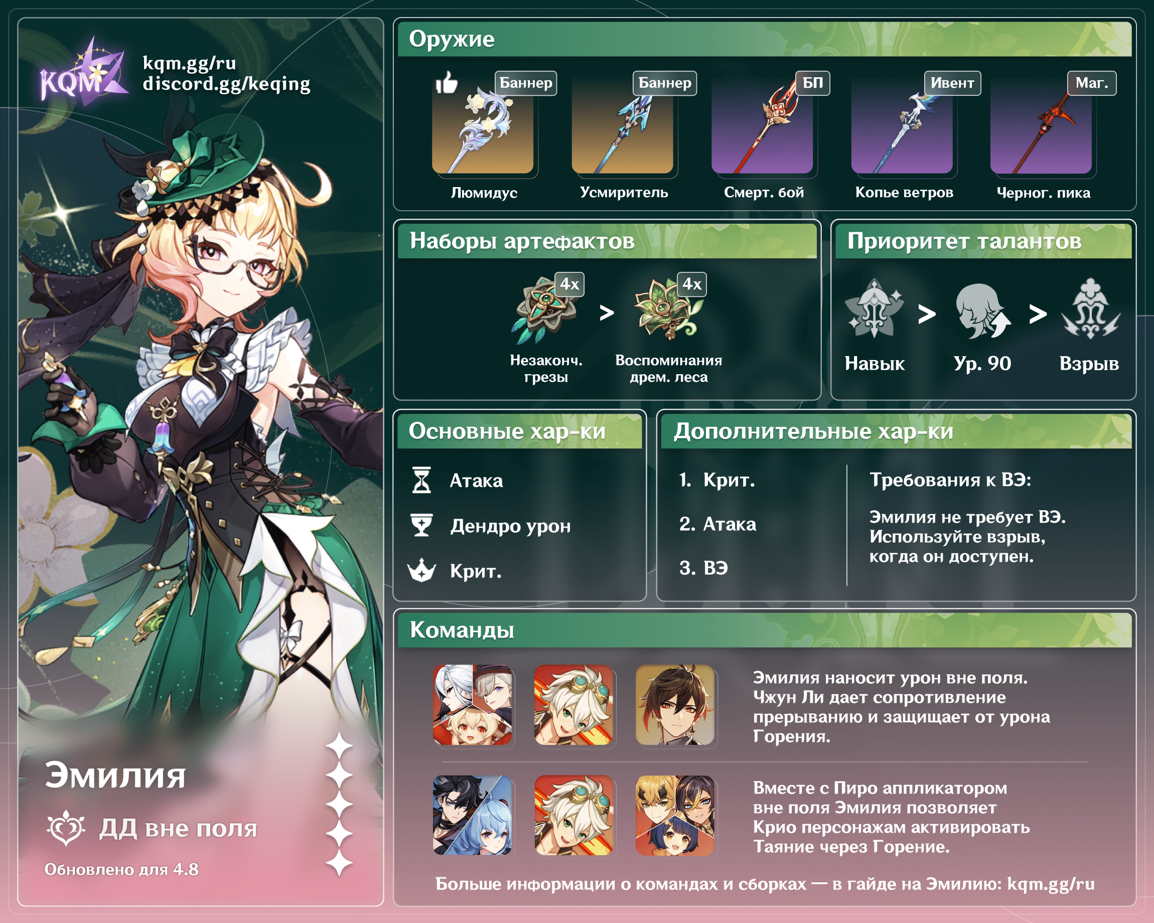 Анемо персонажи повышают урон Пиро ДД благодаря бонусу от 4 предметов Изумрудной тени и собственным баффам. Однако они мало чего дают для личного урона Эмилии.