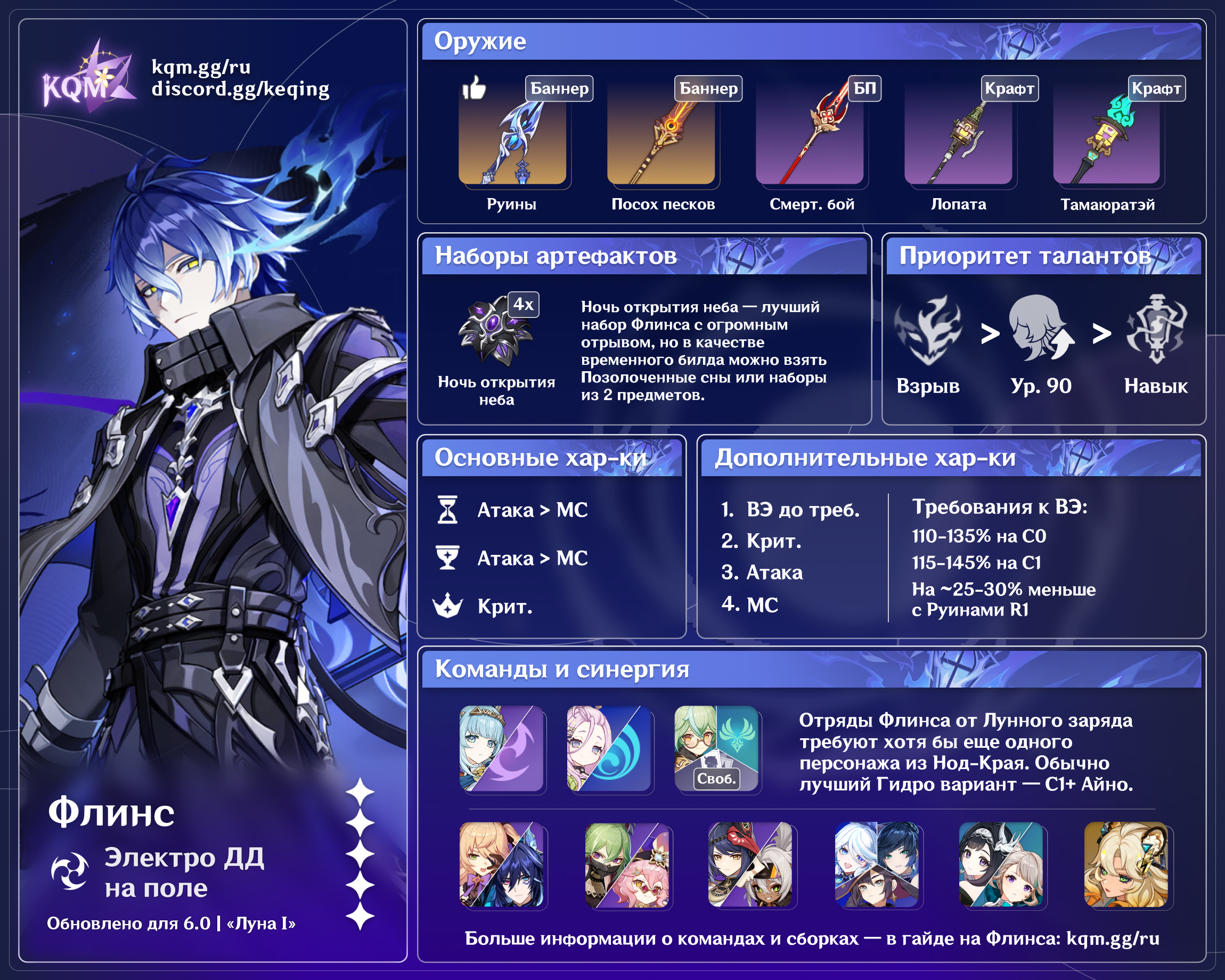 Флинс — 5-звездочный Электро копейщик в Genshin Impact, наносящий много урона Лунным зарядом на поле. В этом кратком гайде вы узнаете о лучших билдах, оружии, артефактах и отрядах для Флинса.