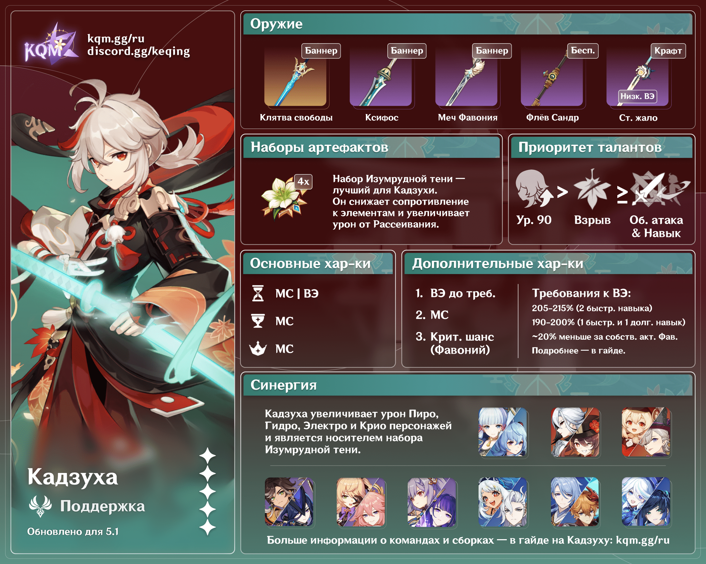 Кадзуха в основном исполняет роль персонажа поддержки вне поля или квиксвап, усиливающего своих элементальных ДД с помощью Таланта возвышения 4 и понижения элементального сопротивления с помощью набора Изумрудной Тени.