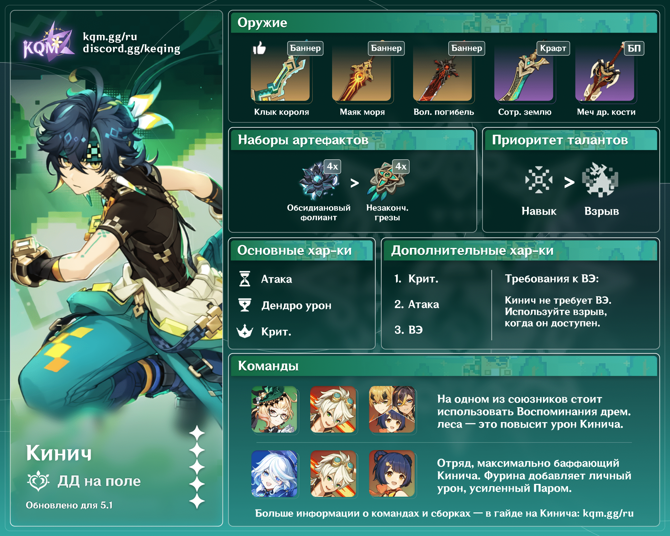 Кинич превосходен в командах с длительным временем действия Горения или стабильными реакциями Цветения. Поэтому его команды следуют довольно стандартной формуле.