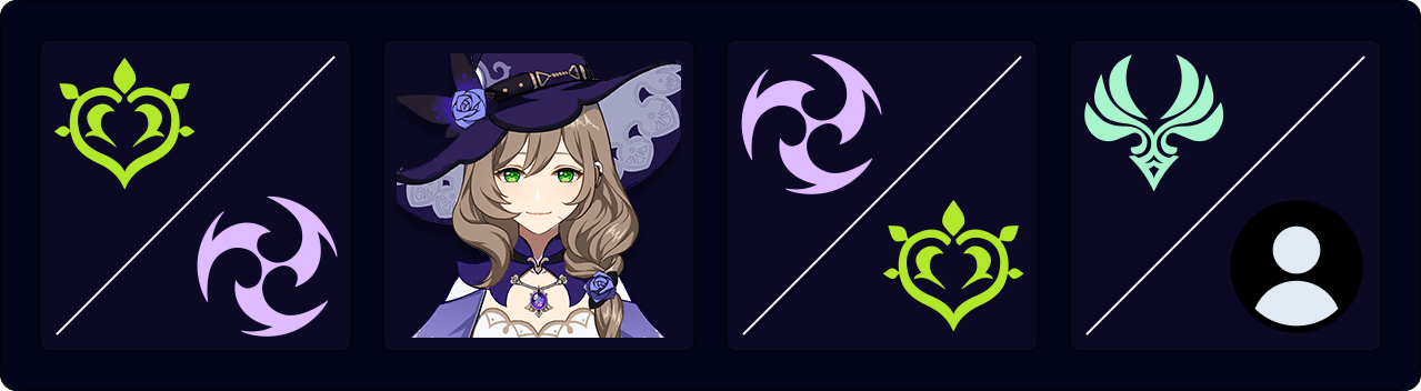 ![]() Электро: Фишль, Оророн, Бэй Доу, Яэ Мико, Синобу или Дори | Второстепенные источники энергии для Лизы, обеспечивающие дополнительный урон. |