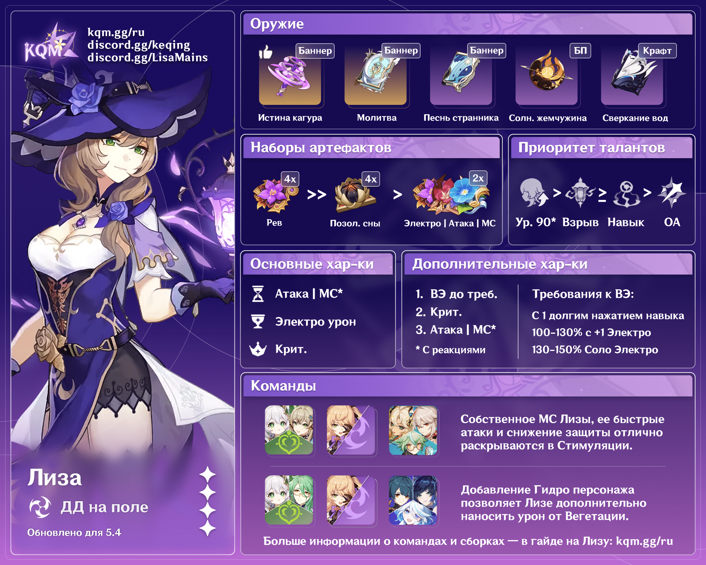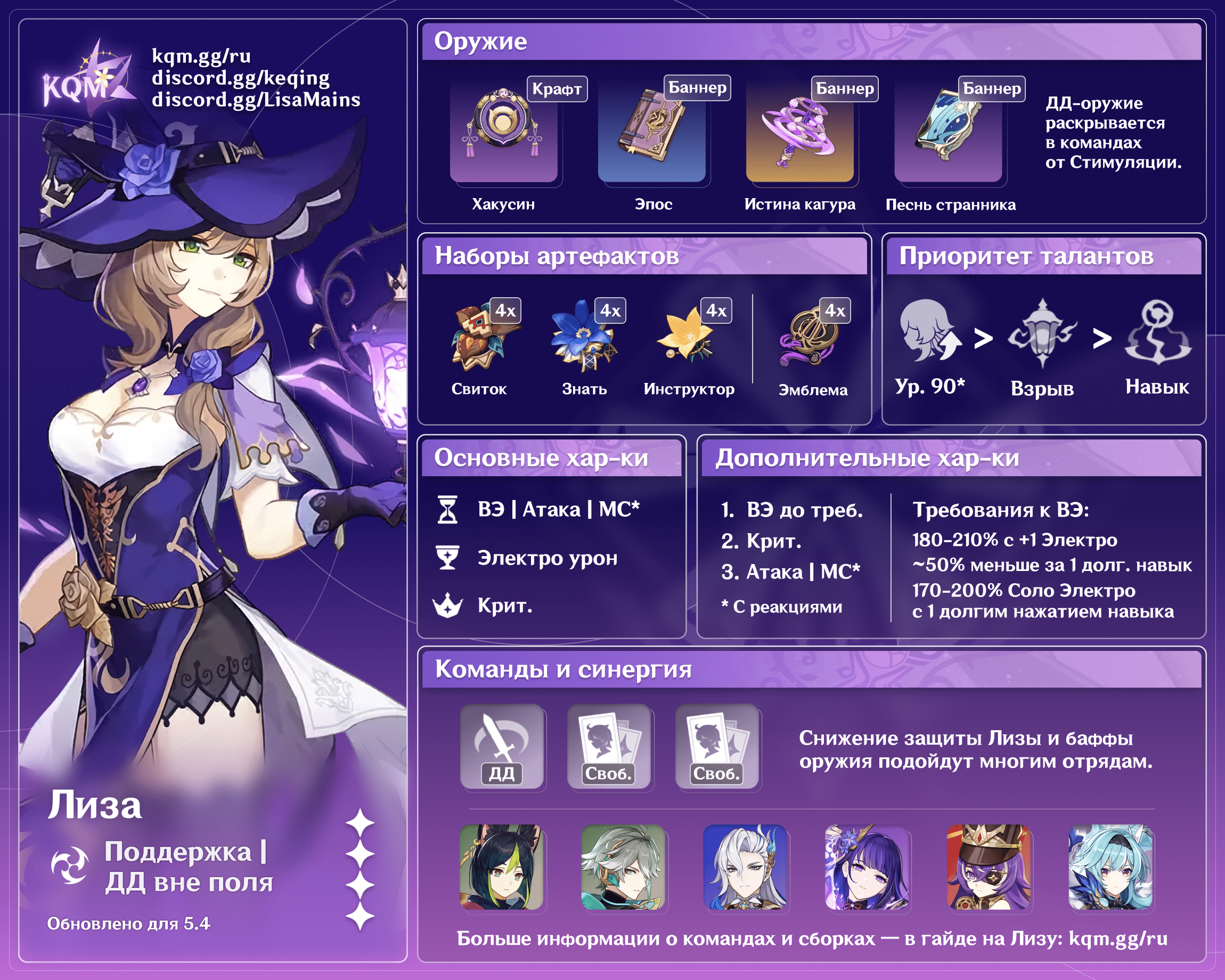 По вопросам касательно других архетипов, в которых можно играть Лизой, обращайтесь к расширенному гайду или соответствующим разделам поддержки на Discord-серверах Lisa Mains и KQM.