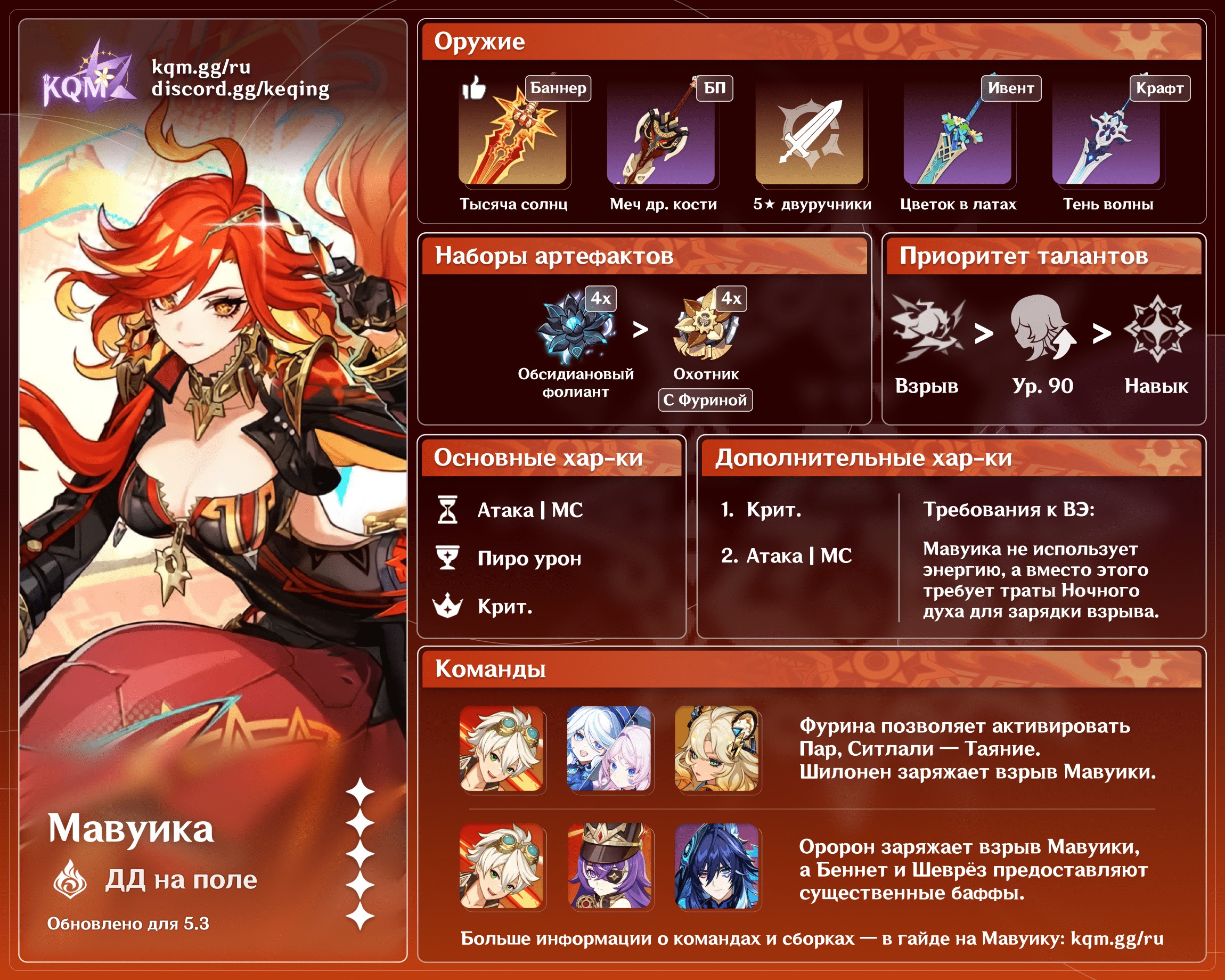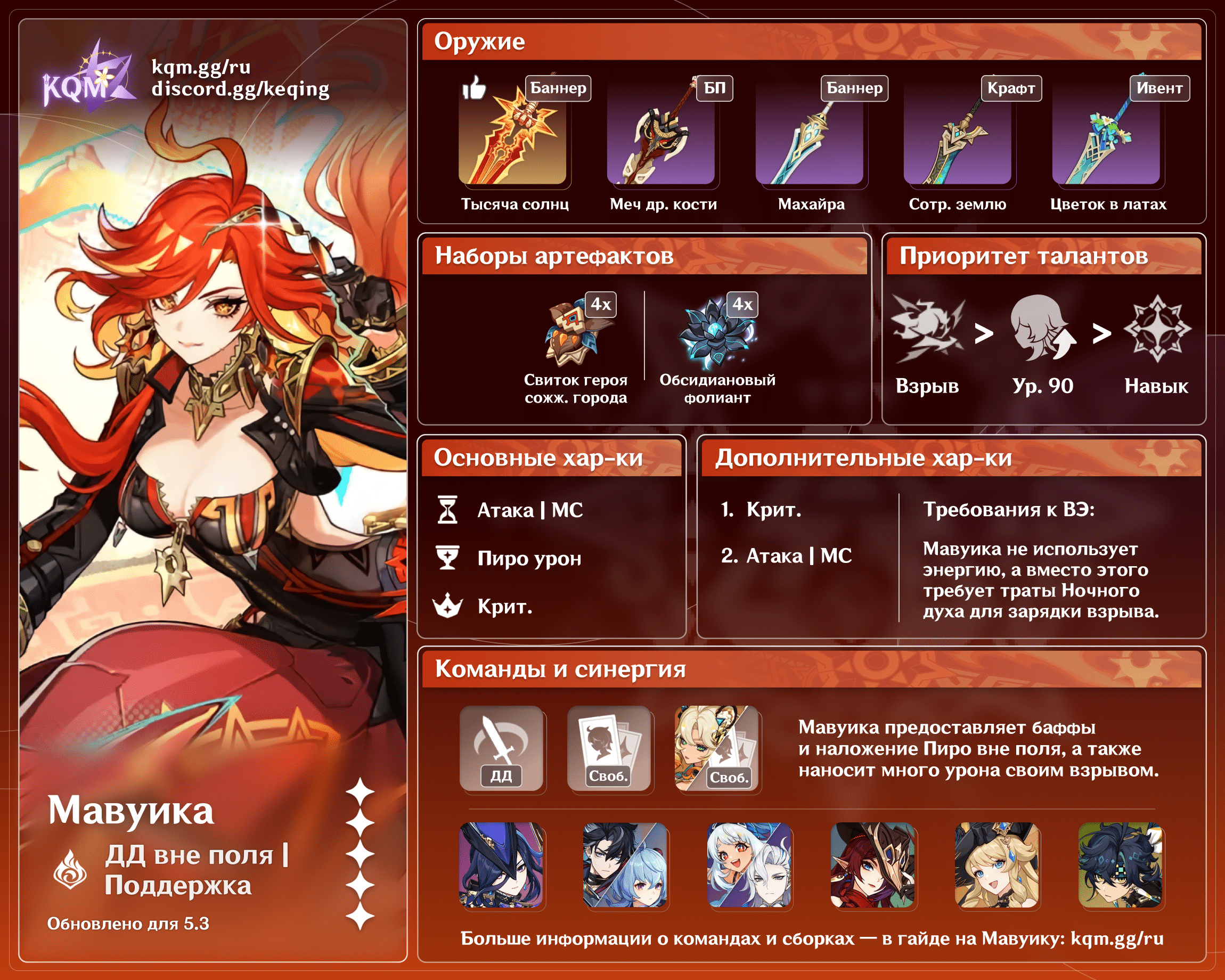 Мавуика — 5-звездочная Пиро двуручница в Genshin Impact, способная наносить мощные взрывные удары и поддерживать высокий урон в бою. Из этого краткого гайда вы узнаете о лучших сборках, оружии, артефактах и отрядах для Мавуики.