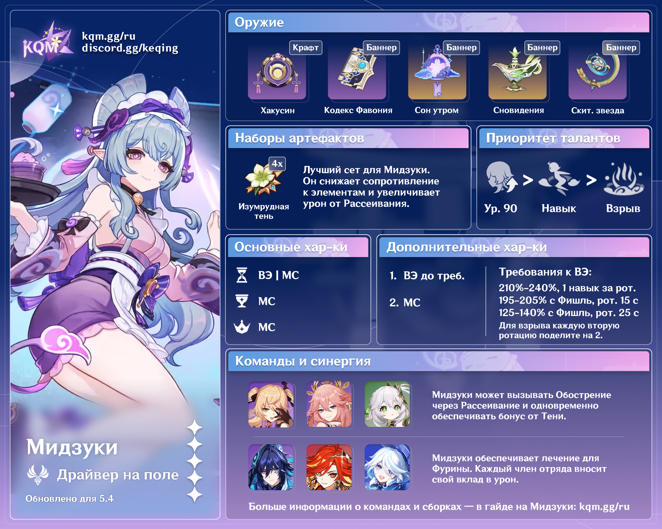 Мидзуки — 5-звездочная Анемо каталистка в Genshin Impact, чей стиль игры сосредоточен на усилении реакции Рассеивание и нанесении урона этой реакцией на поле. Из этого краткого гайда вы узнаете о лучших билдах, оружии, артефактах и отрядах для Мидзуки.
