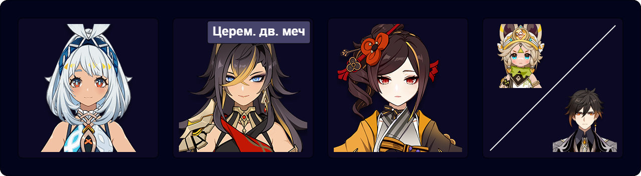 (Муалани N1)¹ > Чжун Ли hED N1² > Кадзуха tEP > Сян Лин Q/N2³ E > (Кадзуха Q)³ > Муалани (Q)⁴ E комбо N1