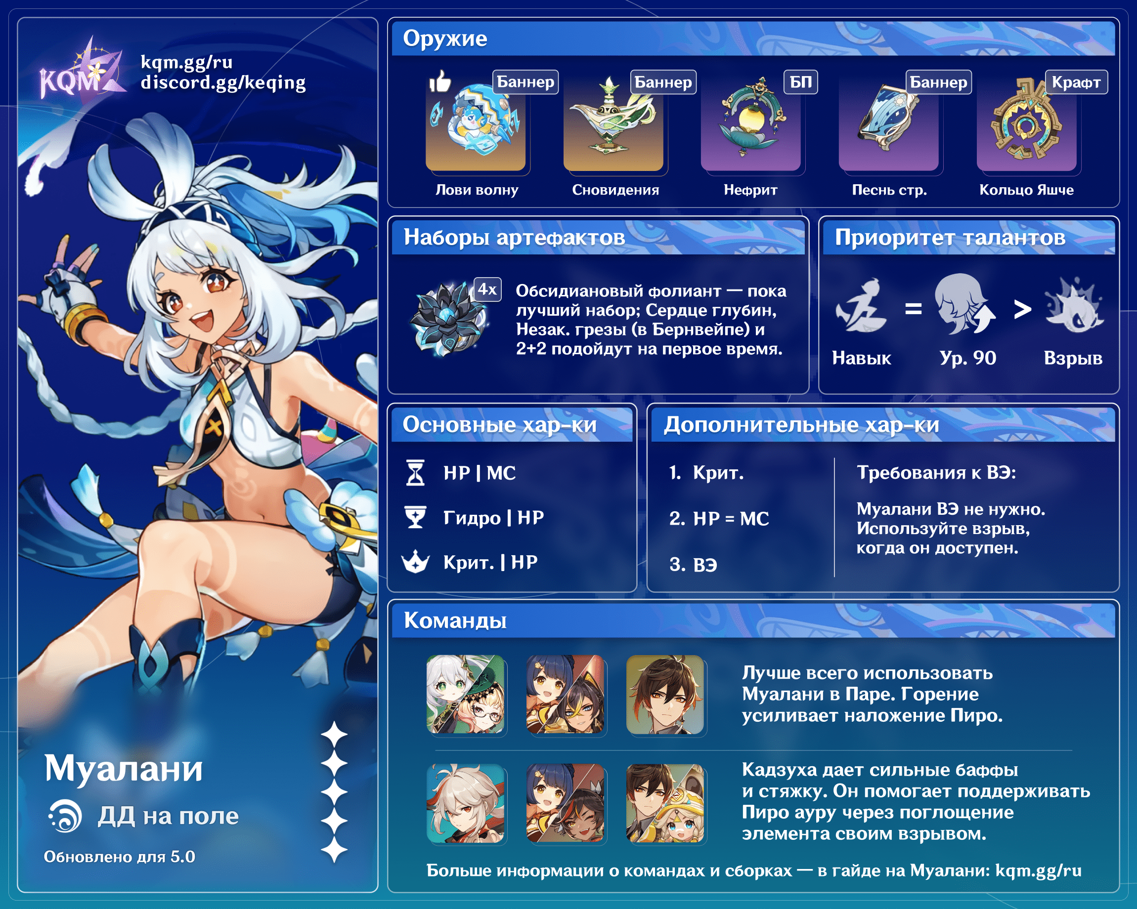 Обратите внимание, что, несмотря на гибкость отрядов с Муалани, она все еще не имеет специализированных саппортов на момент версии 5.0. Вместо этого ее команды используют все доступные варианты персонажей поддержки и включают ДД вне поля (таких как Тиори или Эмилия), которые могут вносить вклад в урон всего отряда.