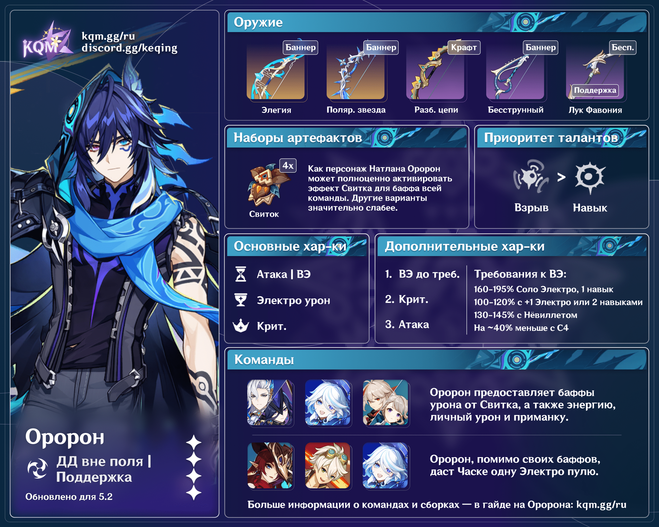 Оророн — 4-звездочный лучник в Genshin Impact, наносящий урон вне поля. Он активирует свой талант В1 и входит в состояние Благословения Ночного духа, когда его союзники наносят урон с характеристикой Ночного духа либо урон реакцией Заряжен. Из этого краткого гайда вы узнаете о лучших сборках, оружии, артефактах и отрядах для Оророна.