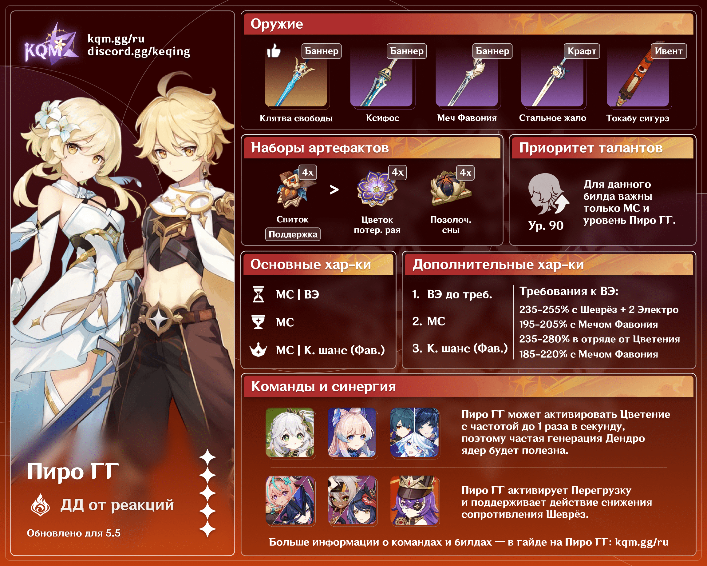 ![]() 5★ Клятва свободы | Премиальный вариант для Пиро ГГ. МС повысит урон реакций, а общекомандный бафф усилит основных ДД отряда. |