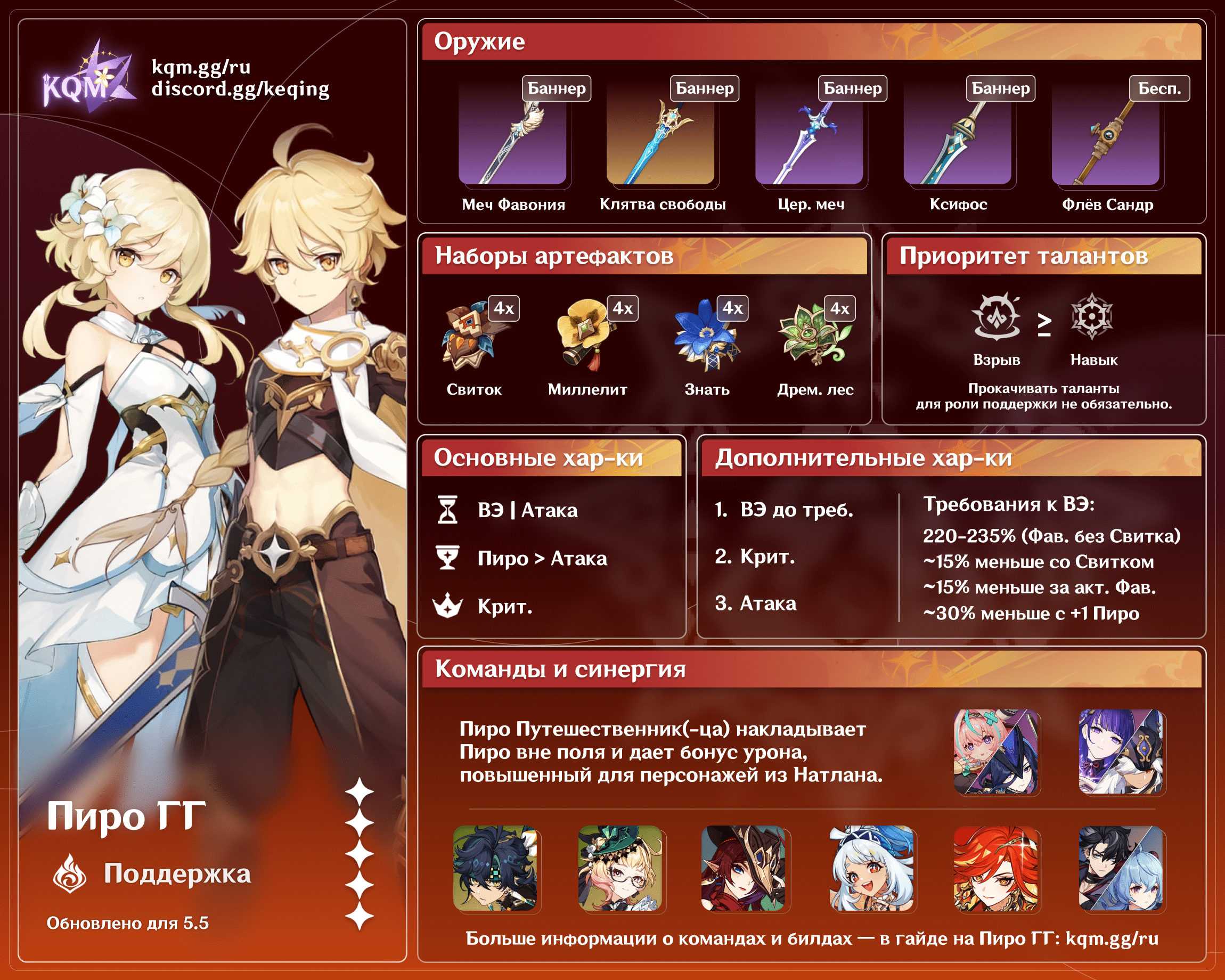 Кинич | Киничу нужно наложение Пиро вне поля для постоянного поддержания Горения, особенно в сценариях с несколькими волнами врагов. Пиро ГГ неплохо подходит на эту роль, имея в арсенале С1 и мощные наборы поддержки наподобие Воспоминаний дремучего леса и Свитка. |