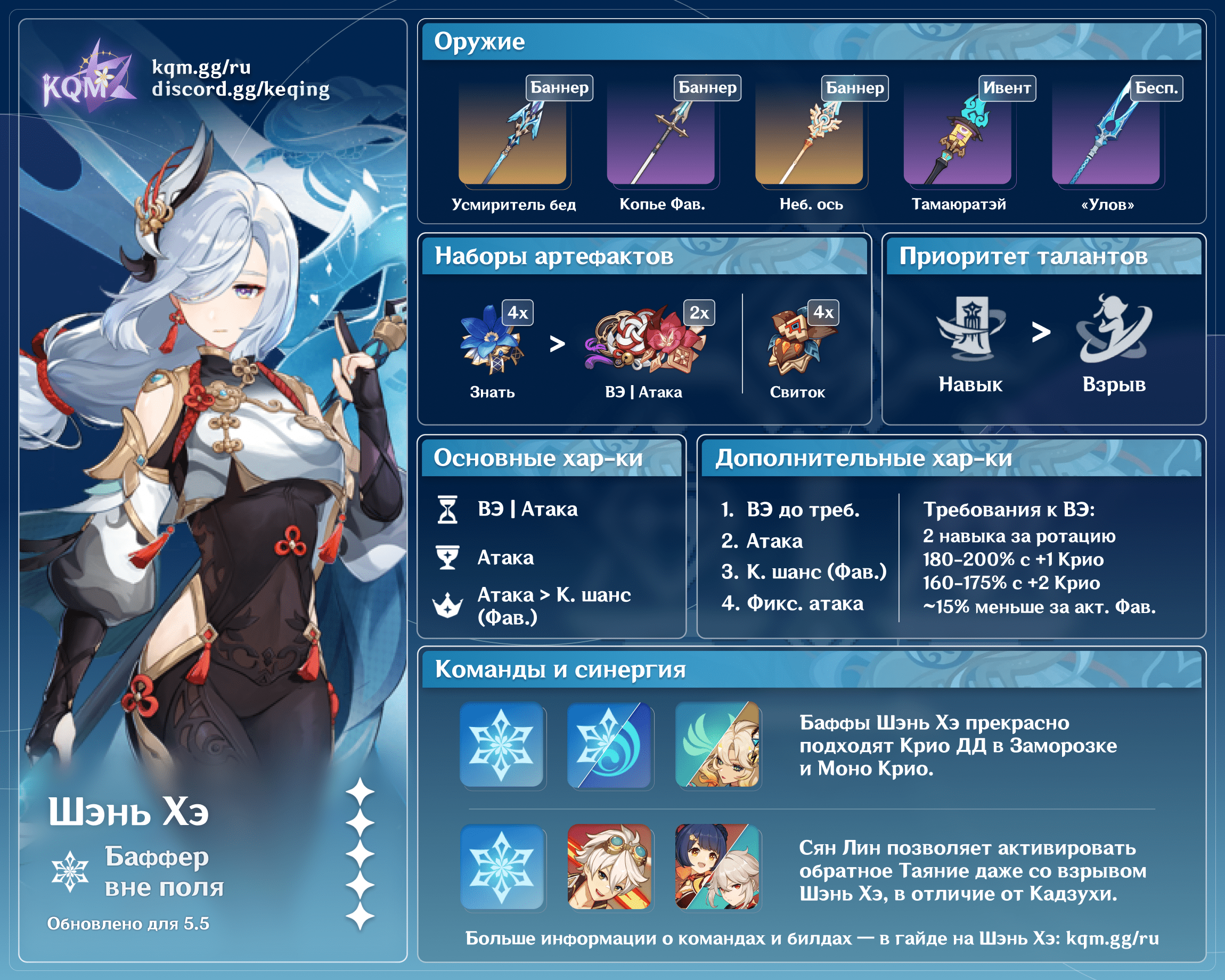Шэнь Хэ — 5-звездочная Крио копейщица в Genshin Impact, которая дает сильные баффы и неплохое наложение Крио вне поля. Из этого краткого гайда вы узнаете о лучших билдах, оружии, артефактах и отрядах для Шэнь Хэ.