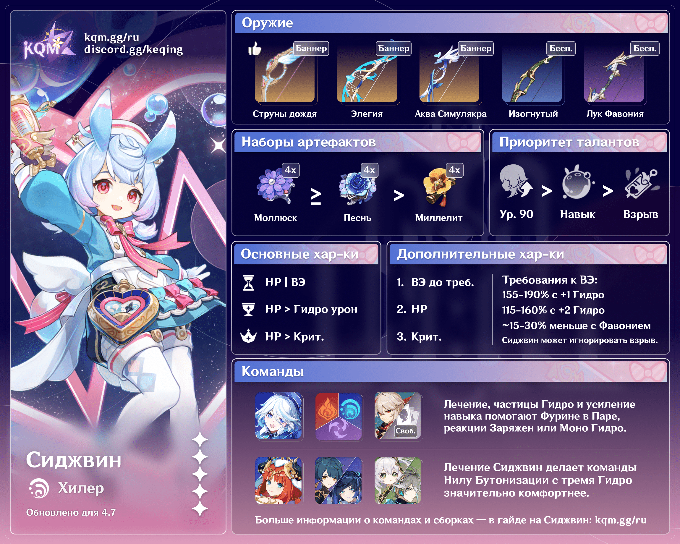 Сиджвин — 5-звездочная Гидро лучница в Genshin Impact, которая предоставляет лечение, бонус к урону навыков вне поля, личный урон и милоту! Только посмотрите на ее розовый пистолетик — и попробуйте сказать, что она не милашка. Вы не сможете. (Она говорит, что если я не переведу этот гайд, то проиграю на следующем баннере.) Из этого краткого гайда вы узнаете о лучших сборках, оружии, артефактах и отрядах для Сиджвин.